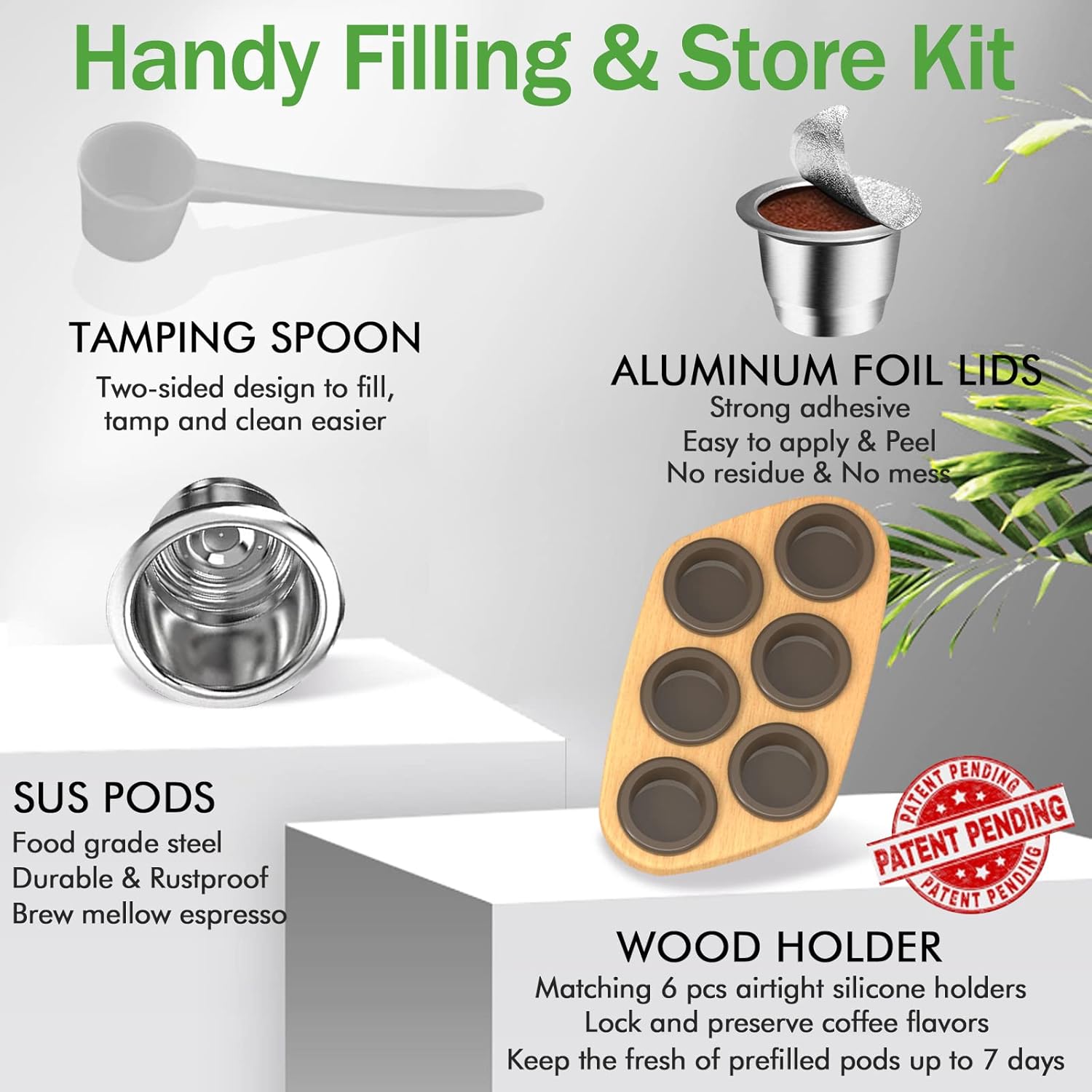 - Prefilled and fresh preserving wood tray: Delicate and premium wood tray with 6pcs rubber holders, which can easily prefill and store 6pcs nespresso refillable pods at one time. The reusable nespresso pods are sealed in airtight rubber holder, protecting and preserving coffee quality, freshness, and intensity that can last for 7 days. Get ready to use anytime