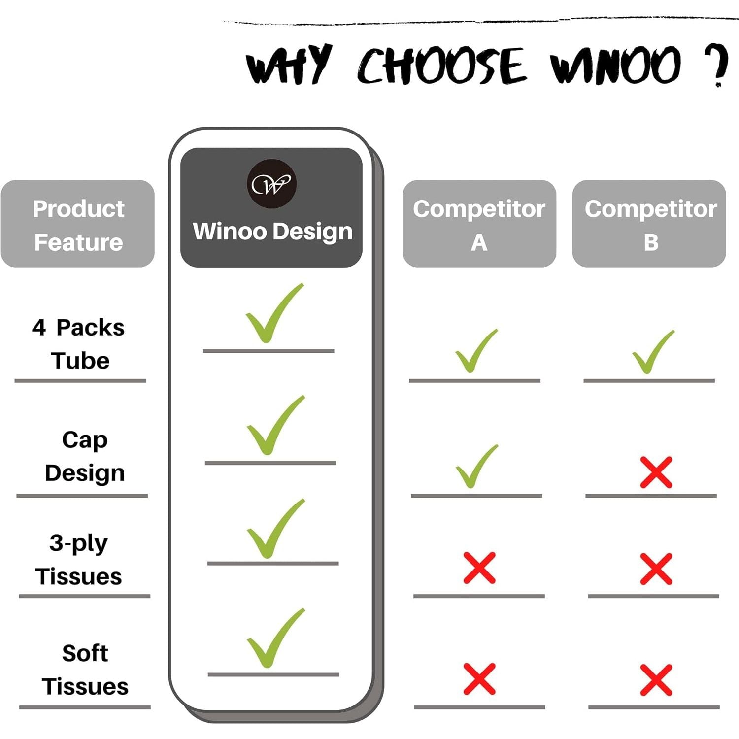 - 𝗖𝗛𝗜𝗖 𝗗𝗘𝗦𝗜𝗚𝗡– It's originally designed and produced by Winoo. With the stylish and modern packaging, the tissue cylinder looks like a decoration piece instead of rectangular brick box, and just so perfect to delight your home or car.