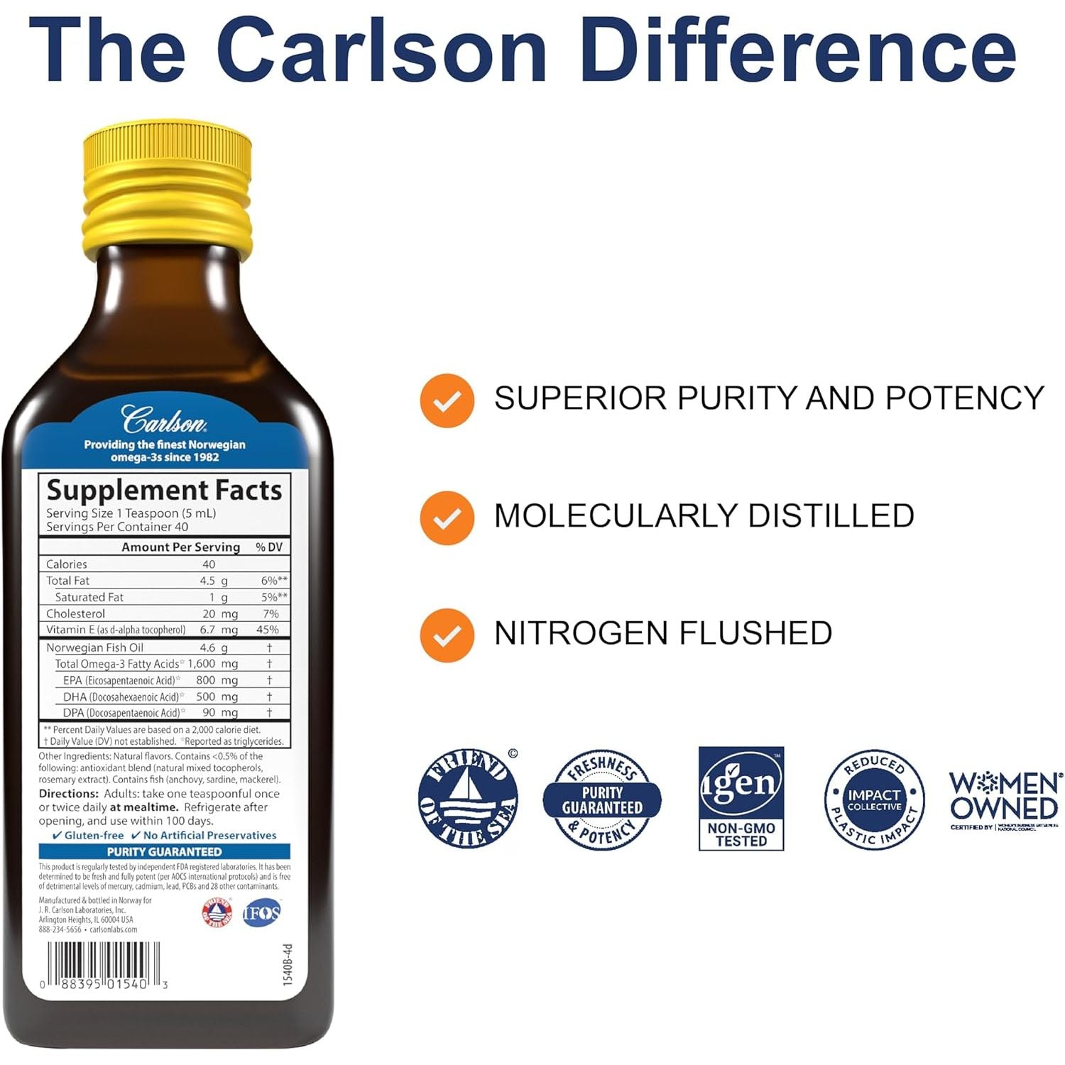 - Carlson - The Very Finest Fish Oil, 1600 mg Omega-3s, Liquid Fish Oil Supplement, Norwegian Fish Oil, Wild-Caught, Sustainably Sourced Fish Oil Liquid, Lemon, 200ml, 6.7 Fl Oz