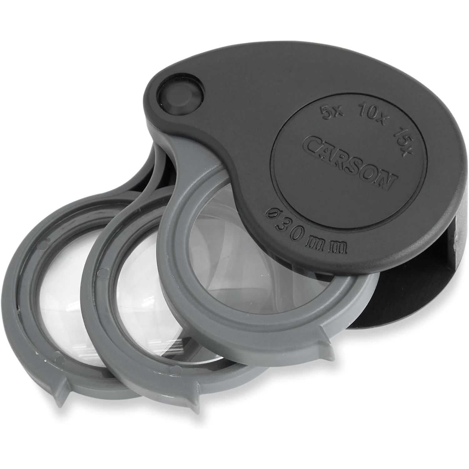 - Carson TriView 5x/10x/15x Folding Loupe Magnifier with Built-in Case, 3-in-1 Portable Loupe Magnifying Glass - Adjustable Magnification, Great for Jewelry (TV-15)