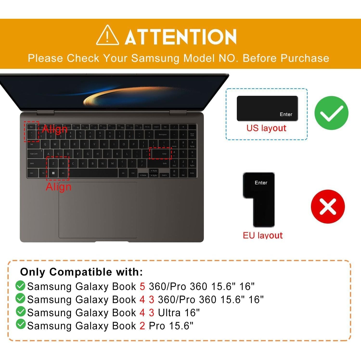 • 【COMPATIBILITY】 - Designed for 2025 Samsung Galaxy Book 5 360 / Galaxy Book 5 Pro 360 15.6" & 16" | 2024 2023 Samsung Galaxy Book 4 15.6" / Galaxy Book 4 360 15.6" / Galaxy Book 4 Pro 360 16"/ Galaxy Book 4 Ultra 16" / Galaxy Book 4 Pro 16" | Samsung Galaxy Book 3 Pro 360 16" NP964XFG NP960XFG | 2022 2021 Samsung Galaxy Book 2 Pro 15.6" Laptop NP950XED NP950XDB |Samsung Galaxy Book Pro 360 15.6" AMOLED Touch-Screen Laptop. Samsung Galaxy Book Pro 15.6 Keyboard Cover Protector. (US Keyboard Layout Only, the shape of "Enter" key is like the "Rectangle"), ❌❌❌Not Fit Galaxy Book 5 Pro 14