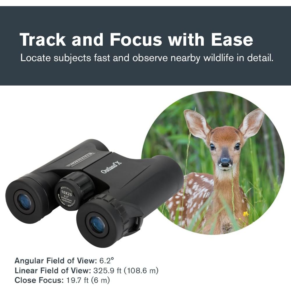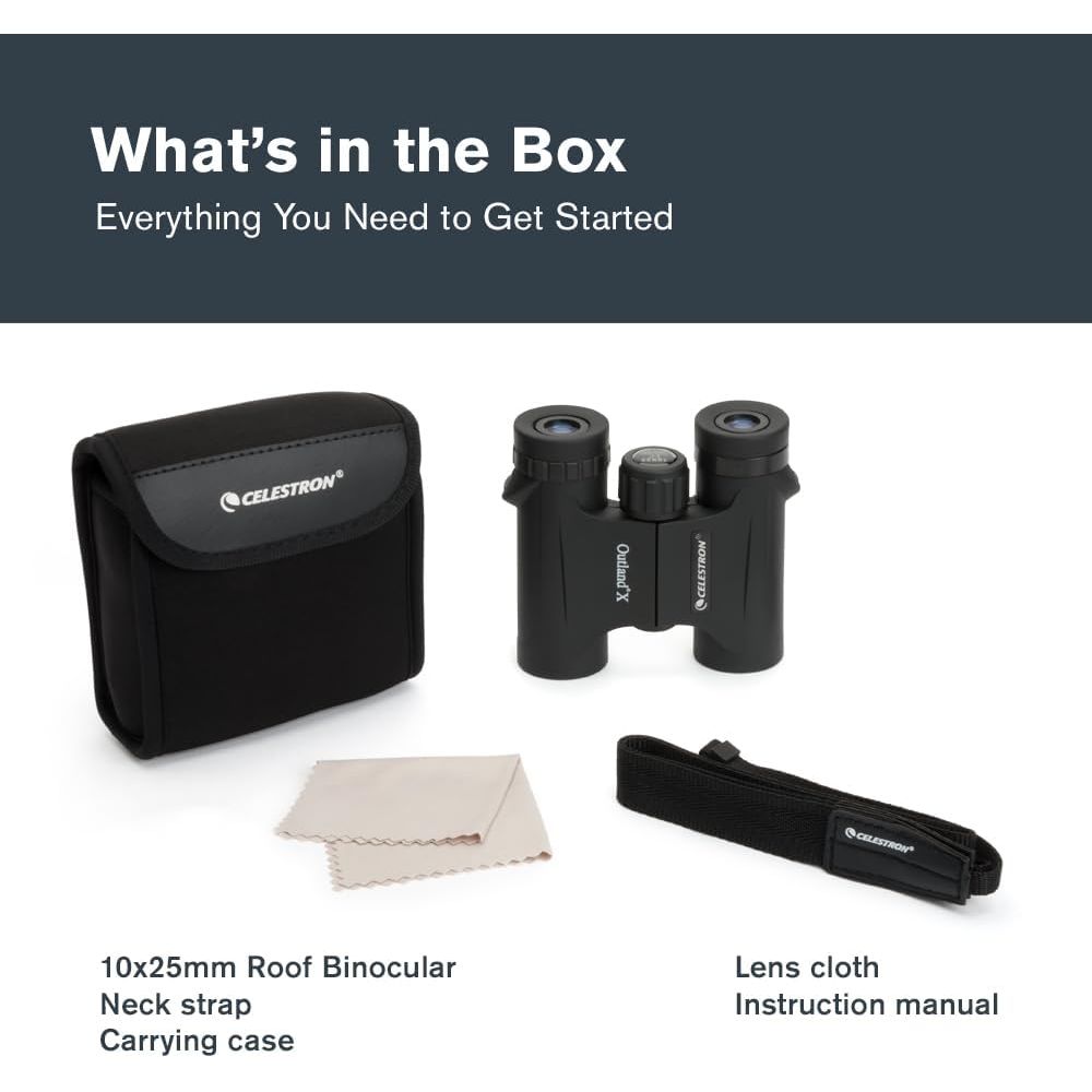 - Celestron - Outland X 10x25 Binoculars – Ideal for Birding and Outdoors – 25mm Objective Lenses – 6.2° Field of View – BaK-4 Prisms – Multi-Coated – Waterproof and Fogproof