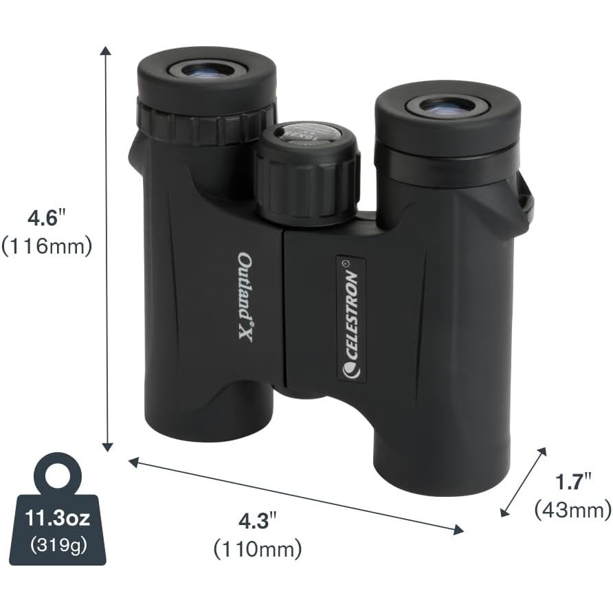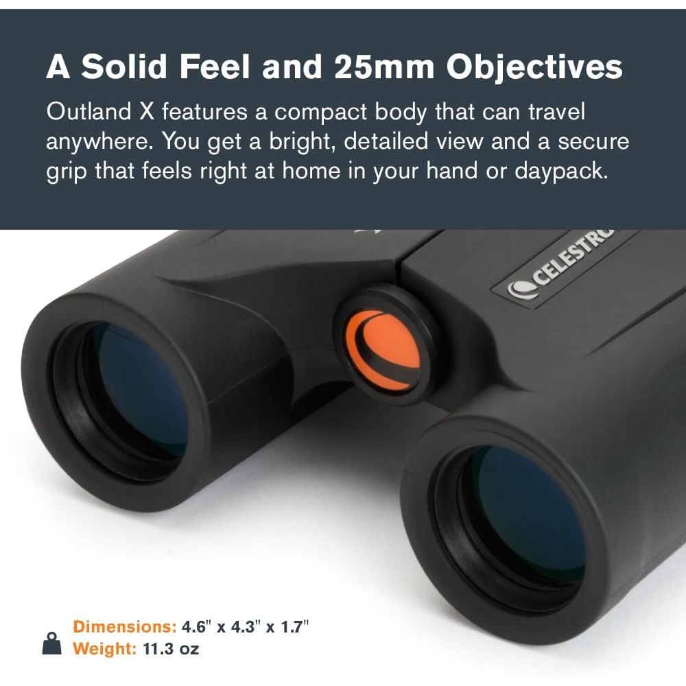 Product Description Celestron’s Outland X 10x25 binoculars are the perfect grab-and-go companion for your next outdoor adventure. Designed with portability and performance in mind, these compact binoculars combine rugged build quality with high-quality optics to deliver bright, detailed views wherever you go. With 10x magnification, the Outland X makes it easy to observe distant subjects—whether you’re birdwatching, hiking, or enjoying a game. Its 25mm objective lenses provide bright, high-contrast views in a compact, lightweight design that fits comfortably in your hand or pack. Multi-coated optics improve light transmission for clearer views, while BaK-4 prisms enhance contrast and resolution. You’ll enjoy color-accurate images from sunrise to sunset, whether you're tracking birds in flight or scanning wide-open vistas. The wide 6.2° angular field of view lets you follow movement effortlessly and take in more of the scene at once. Built for the elements, Outland X binoculars are fully waterproof and fogproof—sealed and nitrogen-purged to perform reliably in changing weather conditions. The durable rubber-armored housing provides a secure, non-slip grip and added protection against bumps and drops. Twist-up eyecups ensure comfortable viewing for both eyeglass wearers and non-wearers alike, and the large, textured focus wheel makes it easy to achieve sharp focus even with gloved hands. Outland X 10x25 binoculars include a protective case, neck strap, and a cleaning cloth—everything you need to take them from the trail to the stadium. Backed by Celestron’s Limited Lifetime Warranty and expert U.S.-based customer support. From the Manufacturer Outland X 10x25 Binocular Outland X 10x25 - General Features Multi-Coated Optics Waterproof and Fogproof Protective Rubber Covering Twist-up Eyecups for Quick Adjustment Moisture Resistant Neoprene Carrying Case No Fault Lifetime Warranty Details See the outdoors in a whole new way! Celestron's compact Outland binoculars were designed to meet the needs of every outdoor enthusiast, from birders and hunters to sports fans to travelers. The optics are multi-coated for high resolution and high contrast views. The prisms are made of BaK-4 glass, which provide enhanced color fidelity. Outland X’s rubber armored exterior allows for rough and tough handling. The binoculars are waterproof, fogproof, and nitrogen purged for worry-free use in any weather conditions. Large focus knobs make for easy and precise focusing, while twist-up eyecups allow for quick adjustment of eye relief so that both eyeglass wearers and non-eyeglass wearers can obtain the full field of view. Your binoculars include a comfortable neck strap, making them easy to carry and ready to use. They also come with a handy protective case that can be attached to a belt to keep them protected and close at hand when not in use. Outland X compact binoculars are versatile and a superb value—the ideal choice for all of your outdoor adventures! Specs Magnification10x Objective Lens Diameter 25mm (.98") Angular Field of View 6.3° Linear Field of View (@1000 yds) / @1000 m) 330 ft (110 m) Exit Pupil 2.5mm (.1") Eye Relief 10mm (.39") Close Focus 19.7 ft (6 m) Interpupillary Distance (max) 72mm (2.83") Interpupillary Distance (min) 56mm (2.2") Diopter Adjustment Range ± 3 Twilight Factor 250 Relative Brightness 6.25 Lens Coatings Multi-Coated Prism Glass (Type) Bak-4 Prism Coatings N/A Weight 11 oz (312 g) Environmental Protection Waterproof Nitrogen Filled Yes Tripod Adaptable Yes Carrying Case Cloth Dimensions 113mm x 117mm x 43mm (4.45" x 4.6" x 1.69") Included Accessories Neck strap| Carrying case| Lens cloth| Instruction manual