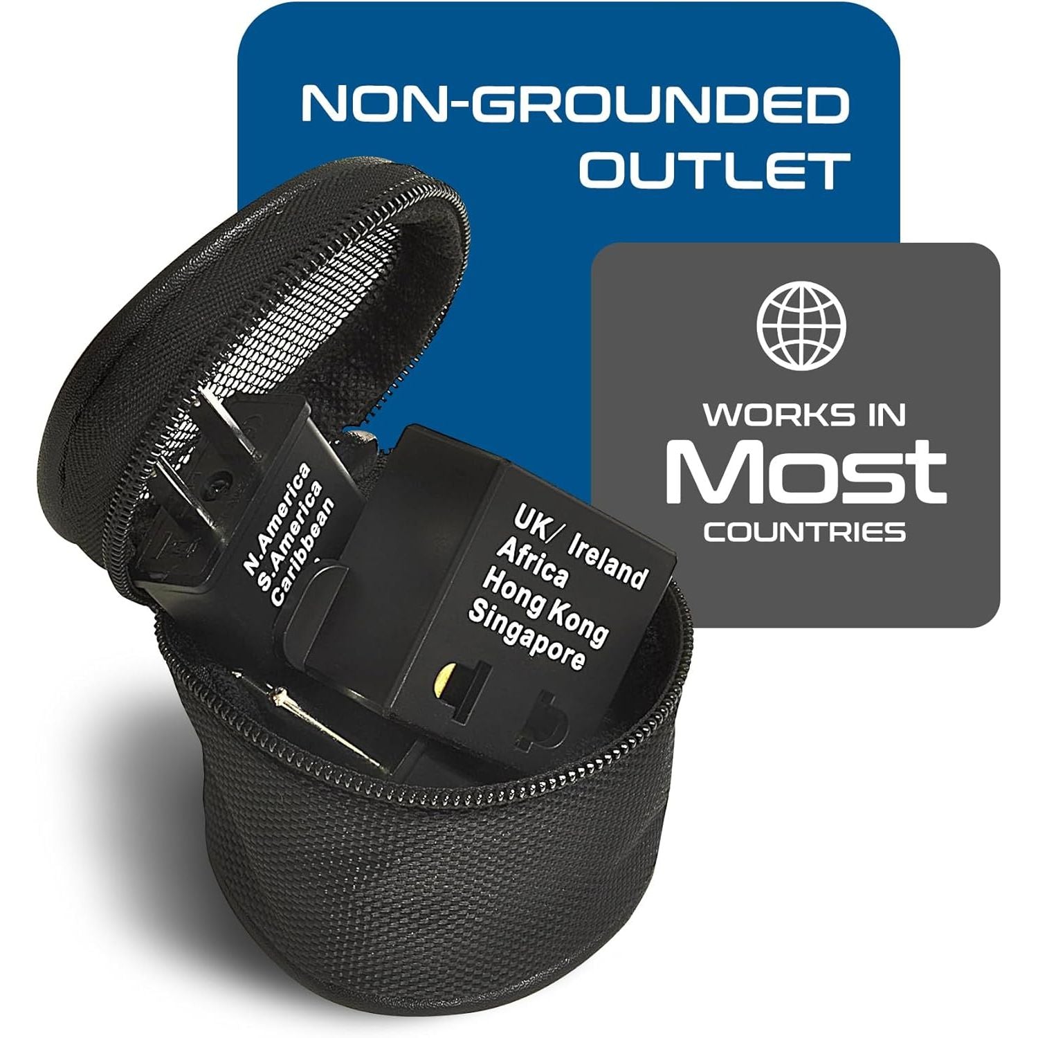 - For international use with dual voltage appliances, Note: These adapters do NOT convert voltage. Accepts two prong US polarized or standard US plugs Set includes a convenient travel pouch