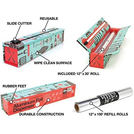 - ChicWrap BBQ Tools Refillable Foil Dispenser - One 12"x 30' Roll of Professional Grade Aluminum Foil - Reusable Dispenser w/Slide Cutter - Kosher Certified - Reduces Waste & Saves Money