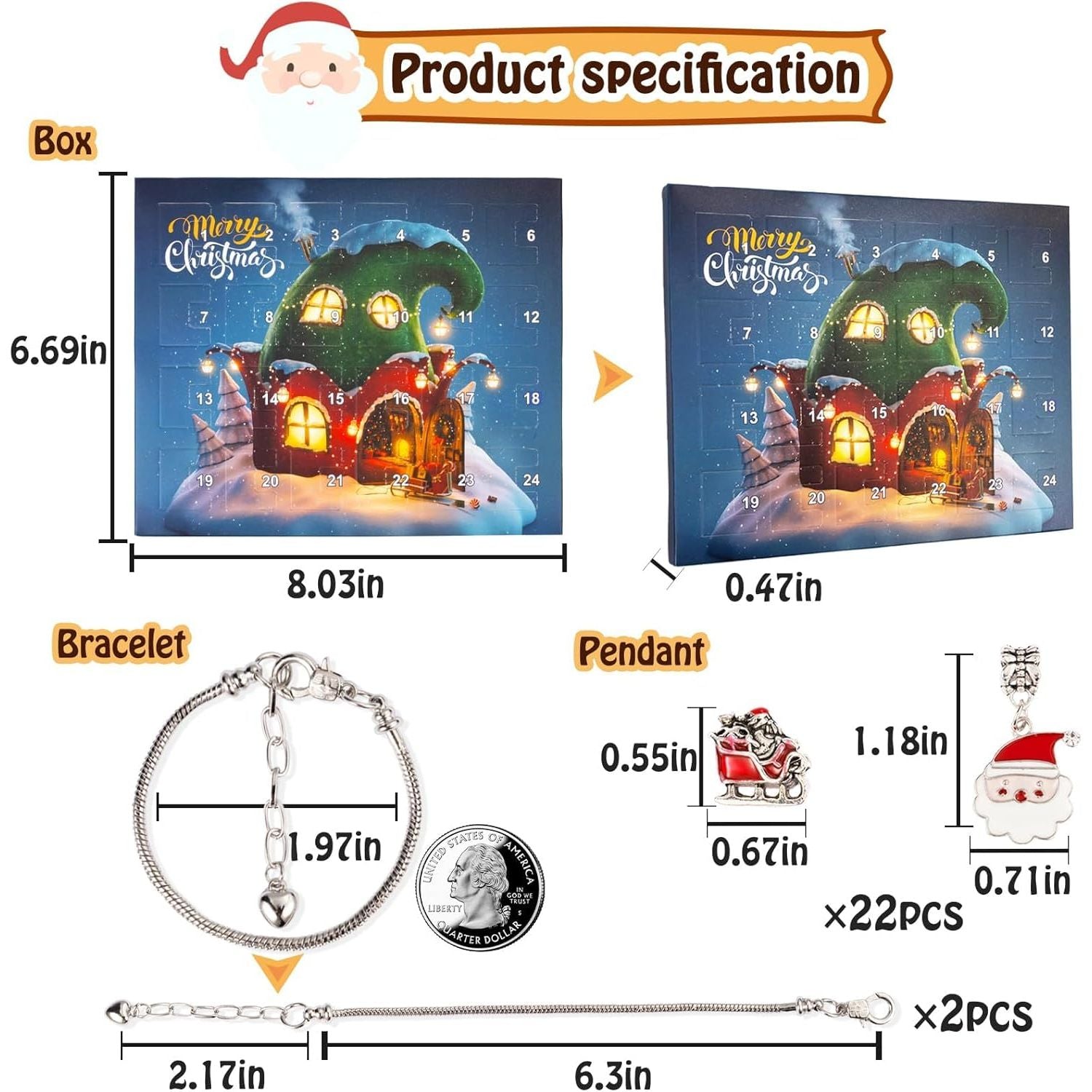 - CHRISTMAS BRACELET CALENDAR: You will receive a Christmas advent calendar with 22 Charm Beads and 2 Bracelet Chains to make 2 Christmas bracelets; The adorable charms are all the theme of Christmas like Santa Claus, Christmas tree, Santa hat, gift box, stocking, snowflake, wreath, candy cane, etc and none duplicates, exquisite and delicate.