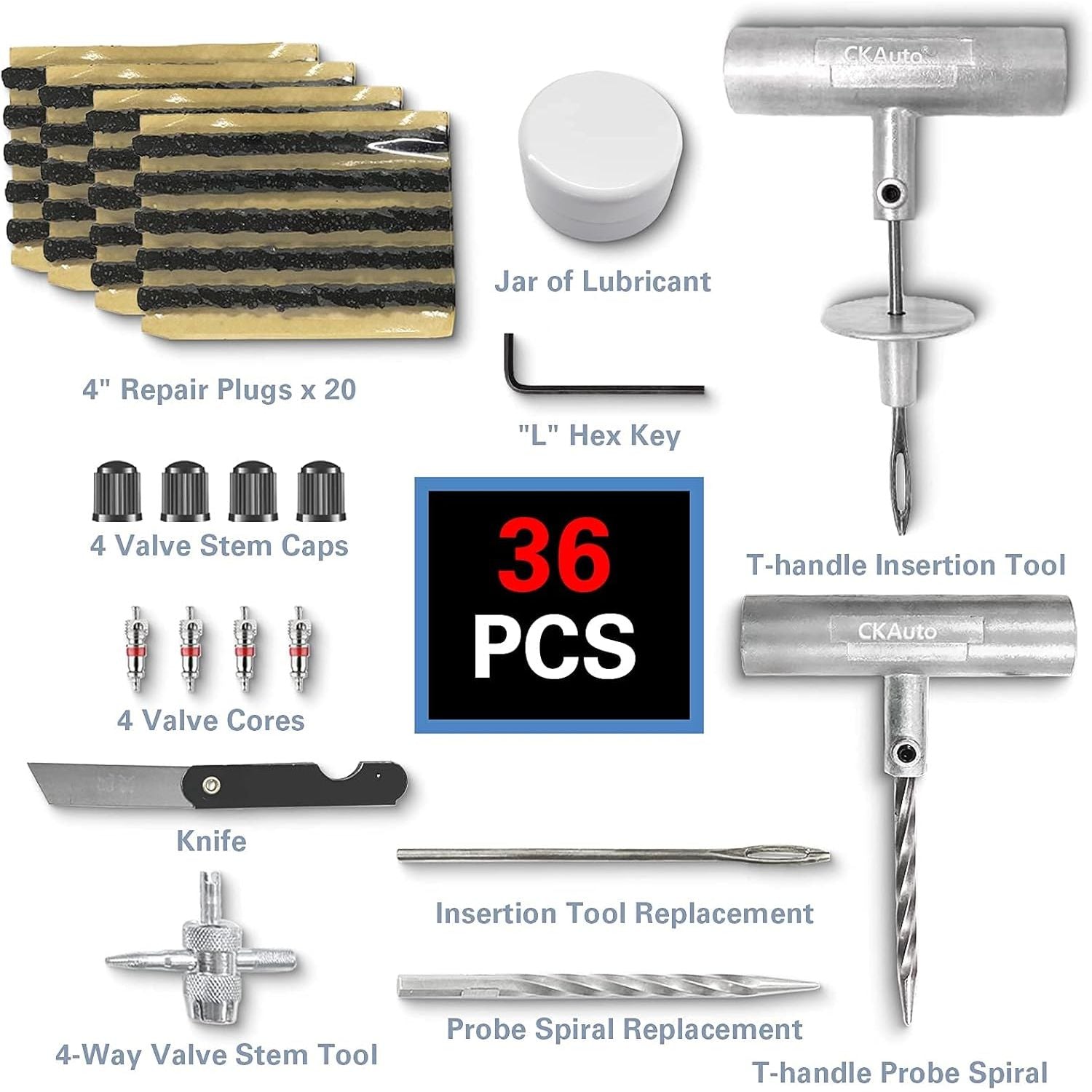 - CKAuto Universal Tire Repair Kit, Heavy Duty Car Emergency Tool Kit for Flat Tire Puncture Repair, 36 Pcs Value Pack, Tire Plug Kit fit for Autos, Cars, Motorcycles, Trucks, RVs, etc.