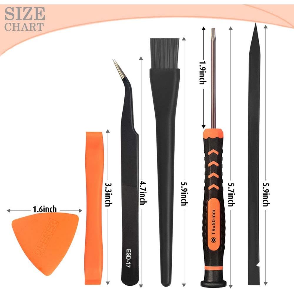 included components ‎T9 Torx Security Screwdriver(with hole in the center) ,PH00 Phillips Screwdriver,PH0 Phillips Screwdriver, PH1 Phillips Screwdriver , Nylon Spudger , Double-end Pry Bar, Short Plastic Pry tool ,Curved Tweezer, Anti-static Cleaning Brush, Opening Pick, Cleaning Cotton Swab