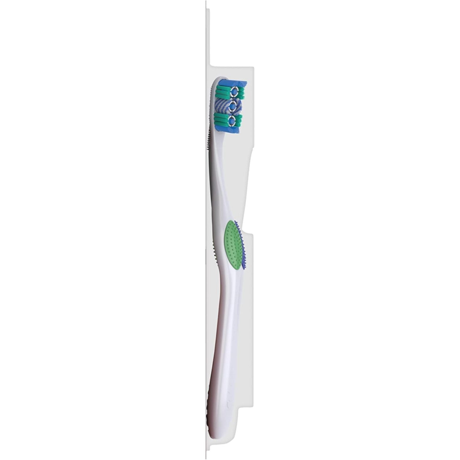 - A convenient tongue and cheek cleaner behind bristles helps remove odor-causing bacteria