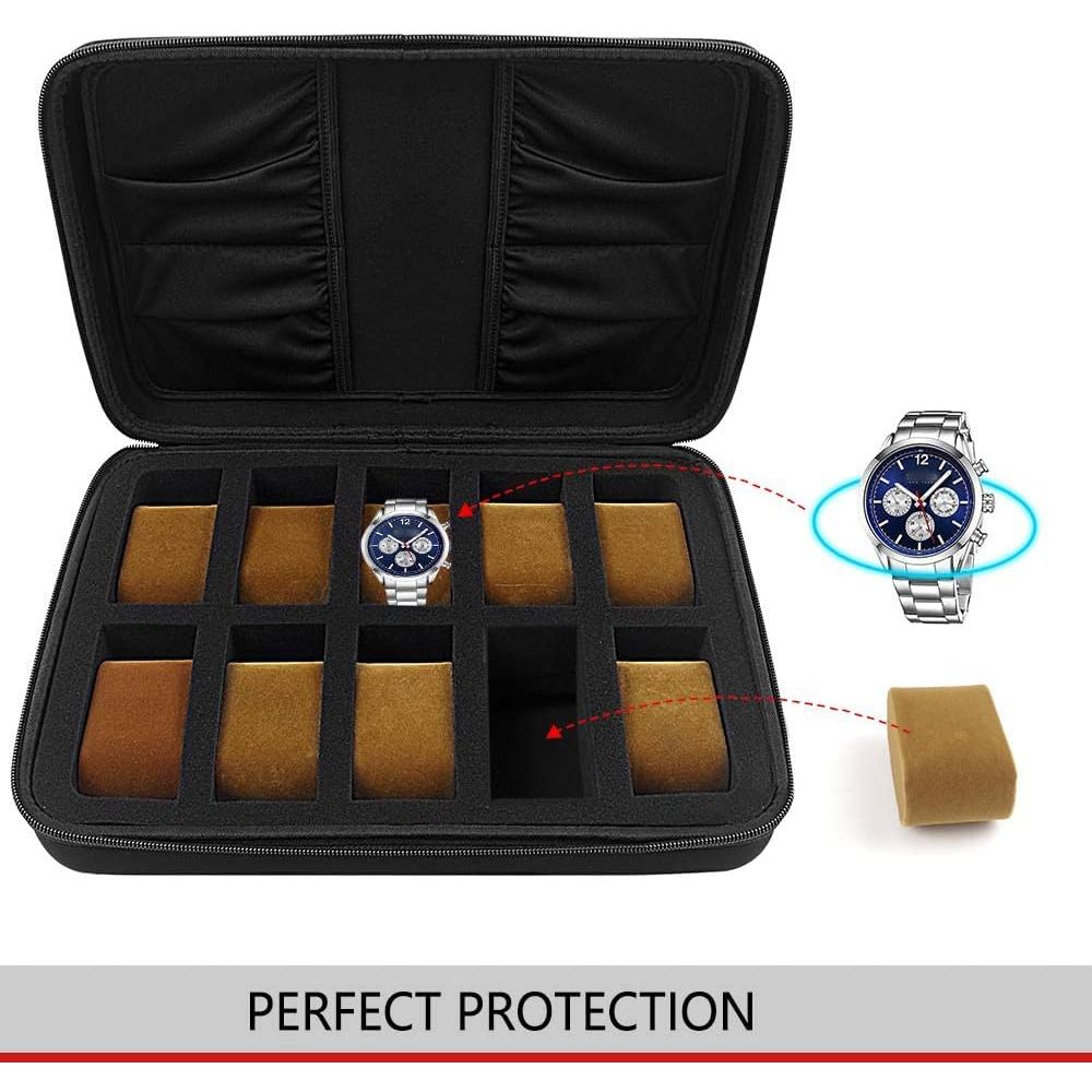 - Personalized Design: There are 10 slots in the box,each watch can be collected separately. 10 removable velvet cushions will protect your watch and provide convenience for your collection. And there are 4 pockets for you to put watch band and other precious.