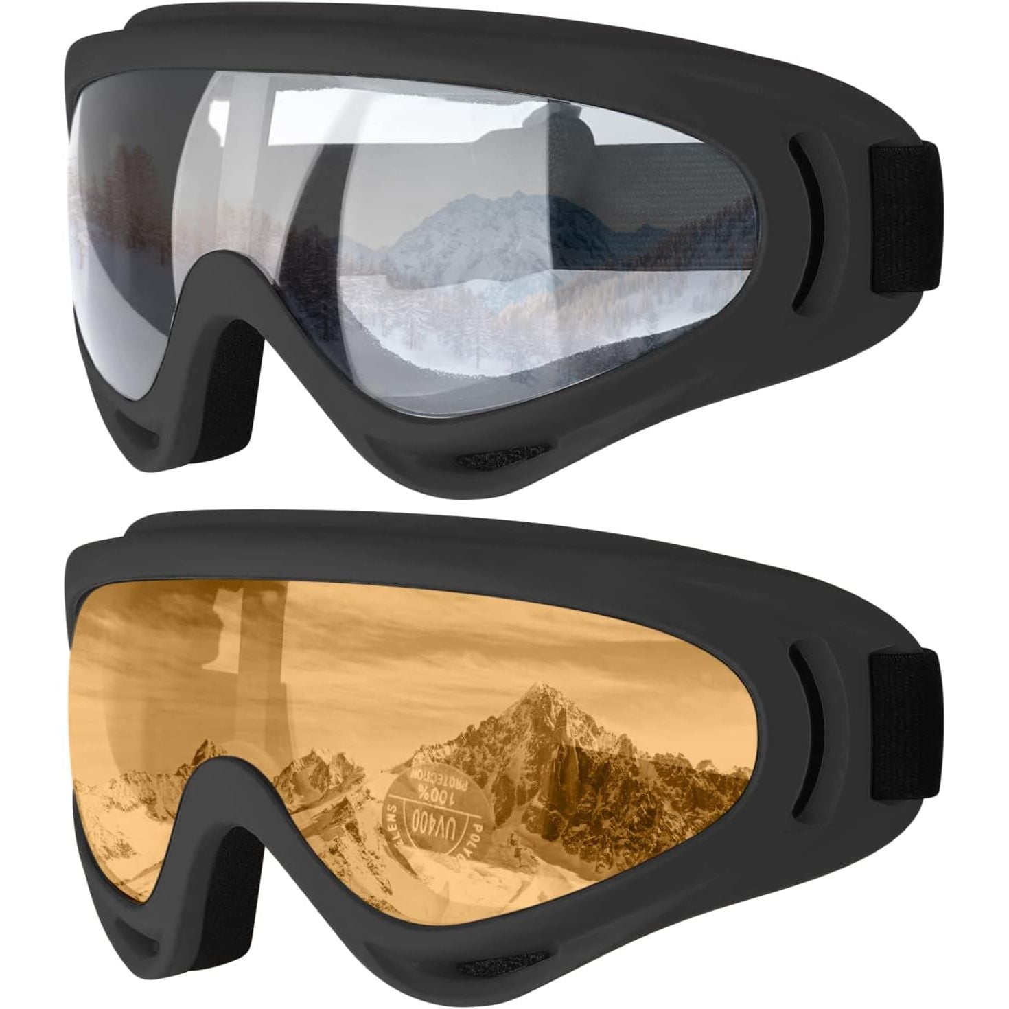 - Performance Snow Goggles: With circular holes are distributed around them to provide maximum airflow in the goggles, which can prevent fog to a certain extent. Tinted lenses offer UV400 protection against UV rays, while clear lenses ensure optimal visibility on cloudy days.