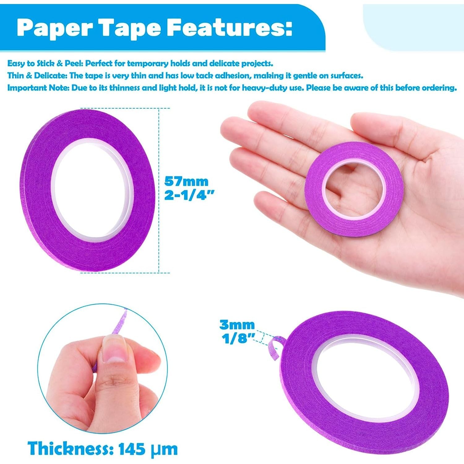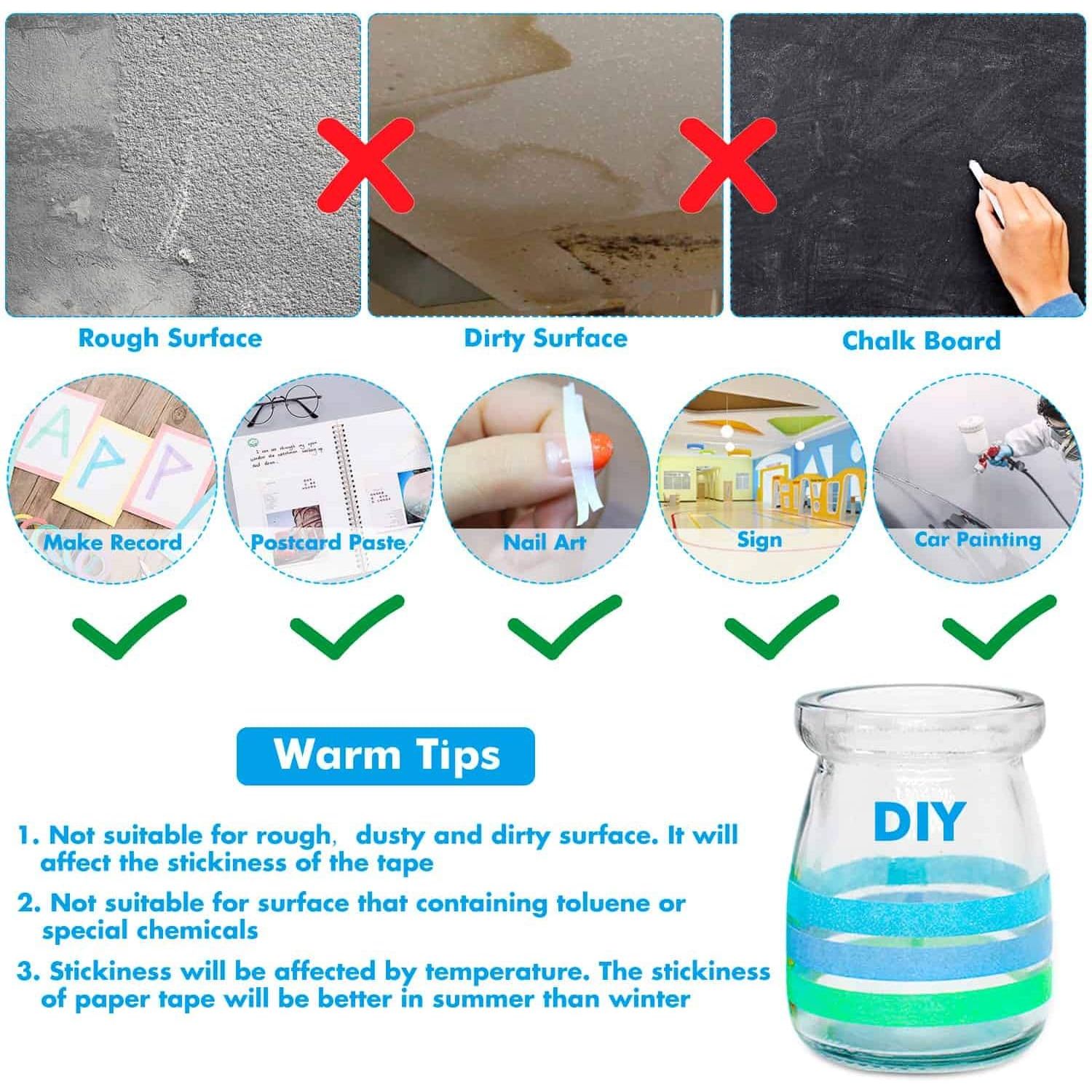 - Easy-to-Use Paper Tape: Applies and removes effortlessly without residue. Please note: This tape is thin and features a light, gentle adhesion, making it perfect for delicate surfaces but not for heavy-duty tasks. Ideal for crafters and painters!