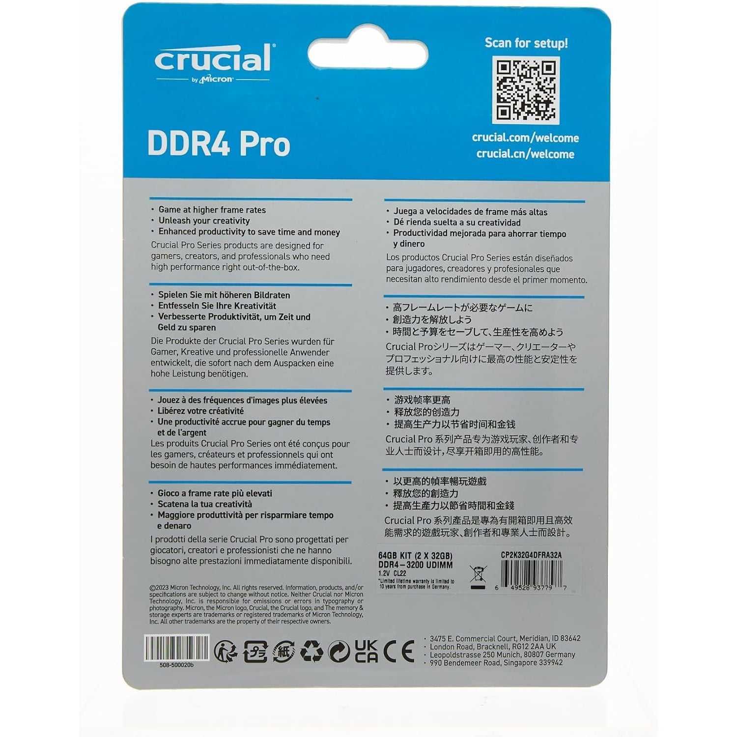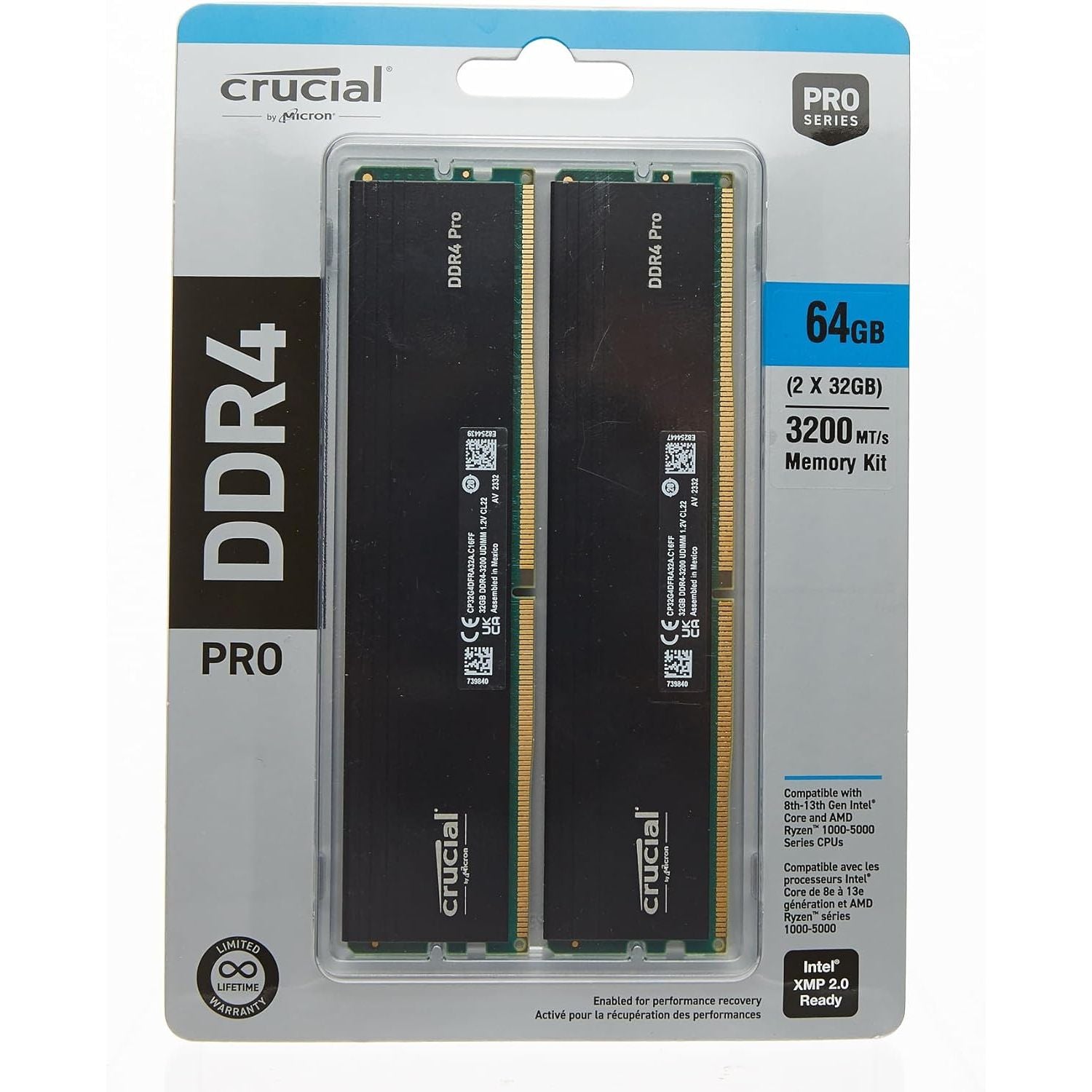 - Crucial Pro 64GB DDR4 RAM Kit (2x32GB), 3200MHz (or 3000MHz or 2666MHz) Desktop Memory, Compatible with Intel and AMD Ryzen - CP2K32G4DFRA32A