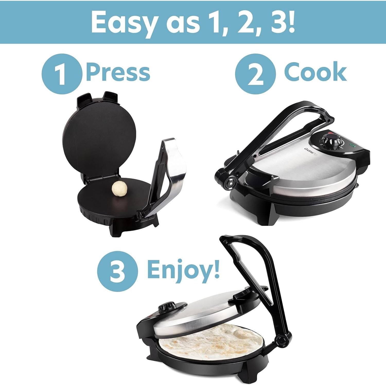 - CucinaPro Electric Tortilla Maker - 10" Pitas, Chapati, Roti, Flatbread, Non-Stick Cooking Plates with Ready Light and Cord Wrap