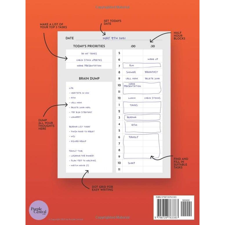 ✓ Timeboxing: Elon Musk's Time Management Method ✓ 100 Days of Daily Time Boxing Planner ✓ Perfect for Scrum and Agile ✓ Stop Procrastinating. This daily planner is the perfect time blocking tool for hourly productivity and anyone who want's to organize their day and achieve their goals. The methods is also used by likes of Bill Gates and is suited for anyone who wants to stop procrastinating. Each time box is designed to help manage and schedule your day in one journal, on one page. Much like time blocking method, popularized by Cal Newport, timeboxing uses blocks of time to manage your tasks. Each block represents 30 minutes of time, and each page is a calendar day. Much used in scrum projects. Physical paper is for the purists. It allowes you to skip apps like todoist, notion or any other daily planing app on the ever so distracting smartphone, and get really in a no distraction, fully focused, productive environment. Includes: • 100 Days A4 Size Paper • 30 Minute Timeboxing blocks • Prioritized To-Do List • Brain Dump for Tasks • Note Taking