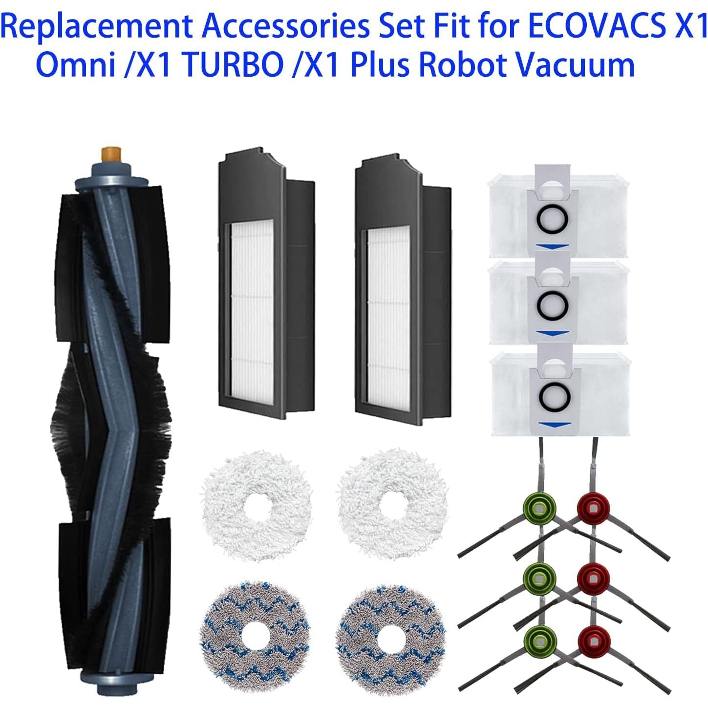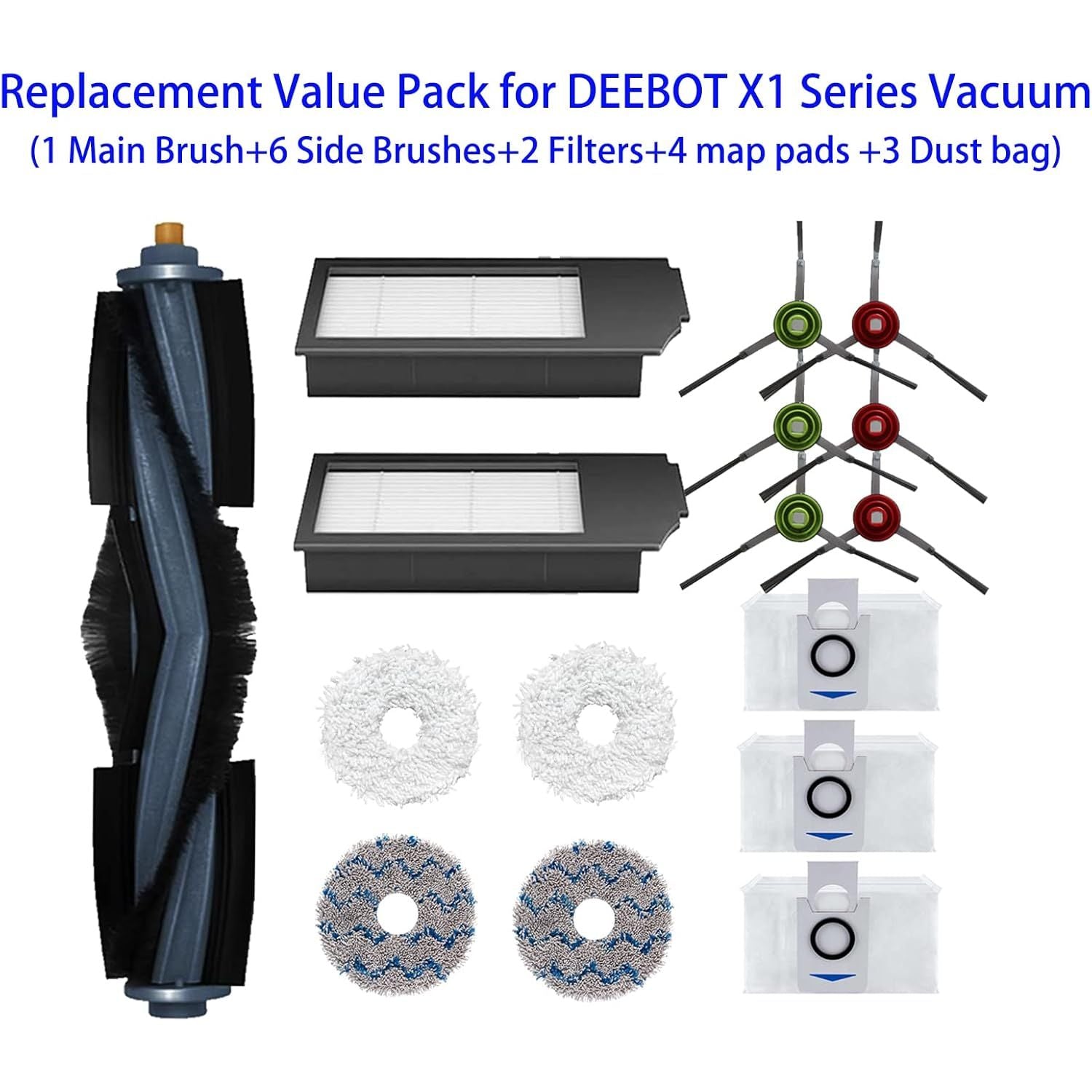 - DEEBOT X1 Series Replacement Accessories Set Fit for ECOVACS X1 Omni / X1 TURBO Robot Vacuum Include 1 Main Brush 6 Side Brushes 2 Filter 4 Mop Pads 3 Dust bag Parts