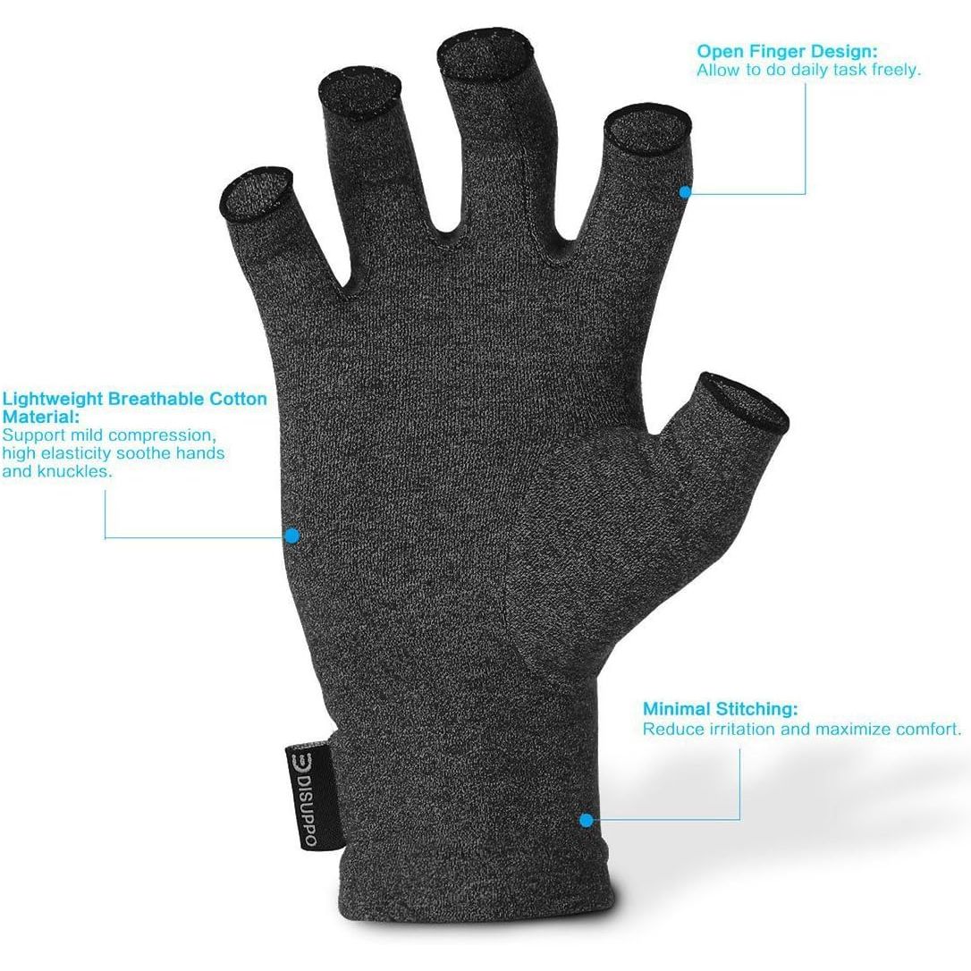 Regular Compression Gloves: These are entry-level compression gloves that are ideal for most individuals. It provides mild levels of compression and warmth. Multifunction Thermal Gloves: These types of gloves are better suited to keep you warm for a longer period of time. This is ideal to regulate temperature a factor to your hands making the joints feel warm. Envelop your aching hand in a soothing bear hug with a strategically contoured, snug fit designed to improve blood flow. Blast that debilitating joint pain right into oblivion and keep right on keep texting, cooking, and living with our ergonomic Fingerless design. Our expertly designed proprietary fabric is created to provide firm gentle compression with maximum flexibility and elasticity. Sleek, modern design, and discreet, near-seamless stitching make these gloves the perfect choice for fashion-conscious men and women. I have RSI in my hands. Does anyone think these arthritis gloves would help a lot? Yes, these fingerless gloves will help. I'm a cashier so use my fingers all day, I wear these gloves whilst I work and have recommended them to customers. Can you wash these compression gloves? I hand wash them and put them over the radiator to try. They dry quickly and are lovely to put on warm. Can I use it when I sleep at night? Yes, they are light enough and comfortable. Is this good for those with Raynaud's? I bought them to help with arthritis. There are many reasons to trust DISUPPO with your daily hand pain relief needs. Relieve pain in hands and fingers and reduce inflammation in joints. Do More of What You Love Finally, get relief from your hard-working hands. Arthritis Gloves Arthritis Gloves Arthritis Gloves Arthritis Gloves Arthritis Gloves