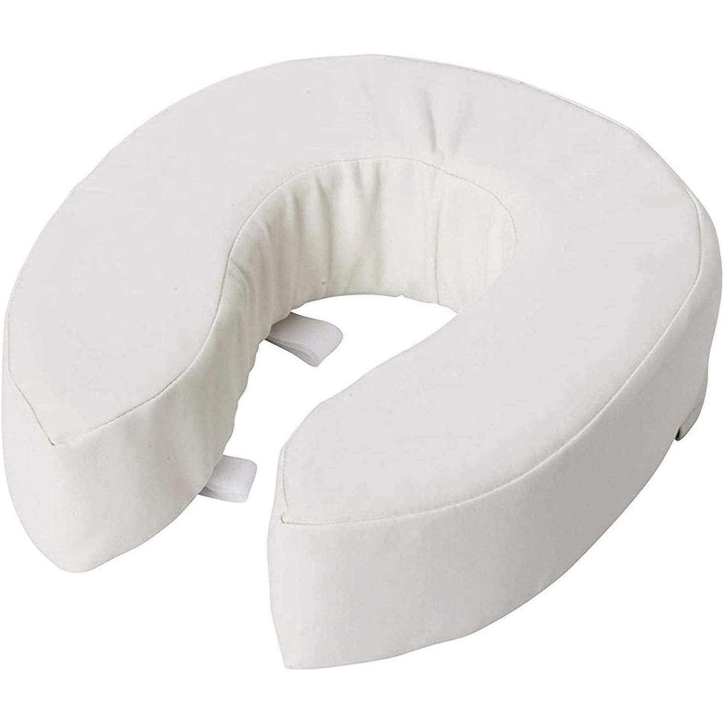 - TOILET SEAT CUSHION is constructed of 2 inch foam with tear resistant white cover. Four hook and loop straps keep the cushion securely in place with a secure hold that will not shift as weight is placed on or off the seat cushion