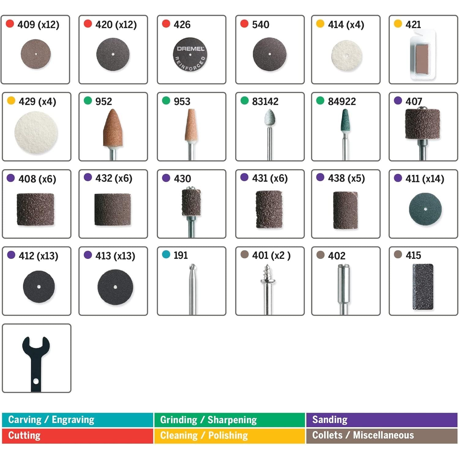 | included components | One EZ409 1-1/2\ Thin-Cut, Cutting Wheel, One EZ456 1-1/2\ Reinforced Cut-Off Wheel, One EZ476 1-1/2\ Plastic Cutting Wheel, One 540 1-1/4\ Cut-Off Wheel, One 428 3/4\ Carbon Steel Brush, Five 414 1/2\ Felt Polishing Wheels, One 421 Polishing Compound, Four 429 1\ Felt Polishing Wheels, One 423E EZ Lock Polishing Cloth, One 8193 5/8\ Aluminum Oxide Grinding Stone, One 83142 Silicon Carbide Grinding Stone, One 191 High-Speed Cutter, One 511E 180 & 280 Grit Abrasive Buffs, One 512E 320 Grit Abrasive Buff, One 407 1/2\ 60 Grit Sanding Drum with Mandrel, Fifteen 408 1/2\ 60 Grit Sanding Bands, Twenty-four 411 3/4\ Sanding Discs, 180 Grit, Twenty-four 412 3/4\ Sanding Discs, 220 Grit, Twenty-four 413 3/4\ Sanding Discs, 240 grit, One 430 1/4\ 60 Grit Sanding Band with Mandrel, Fifteen 431 1/4\ 60 Grit Sanding Bands, Fifteen 432 1/2\ 120 Grit Sanding Bands, Fifteen 438 1/4\ 120 Grit Sanding Bands, Two 401 Mandrels, One 402 Mandrel, One EZ402 Mandrel, One 90962 Wrench, Use Tips: |
