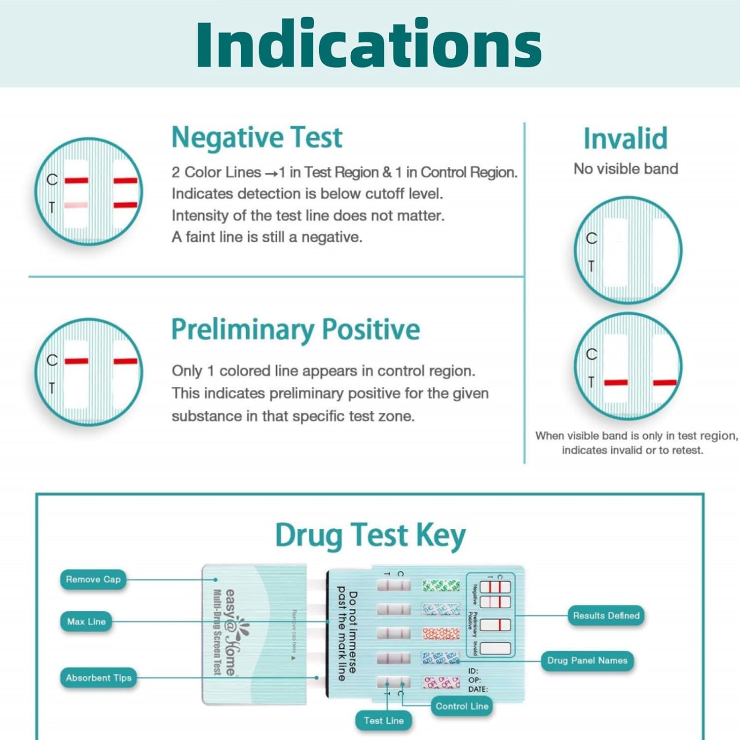 • CLEAR RESULTS: Clear and bold line appears quickly. It is negative if 2 lines appear and is positive if only control line appears. The negative result as quick as 1 minute. NOTE: A very faint test line still means a negative result.