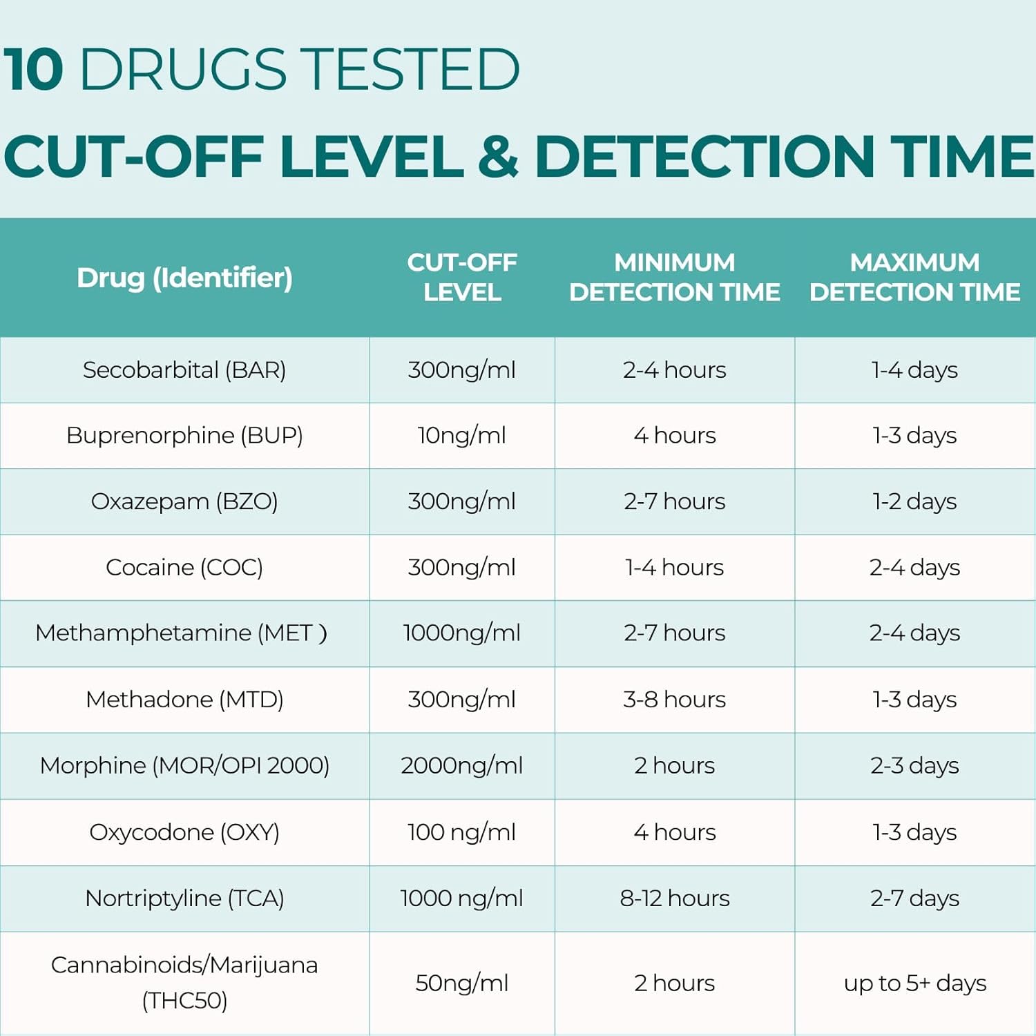 • Tests for 10 drug metabolites in human urine: Oxazepam (BZO), Cocaine (COC),Marijuana (THC),Methamphetamine(MET),Morphine(MOR), Oxycodone (OXY),Secobarbital (BAR), Buprenorphine (BUP), Methadone (MTD), Nortriptyline (TCA)