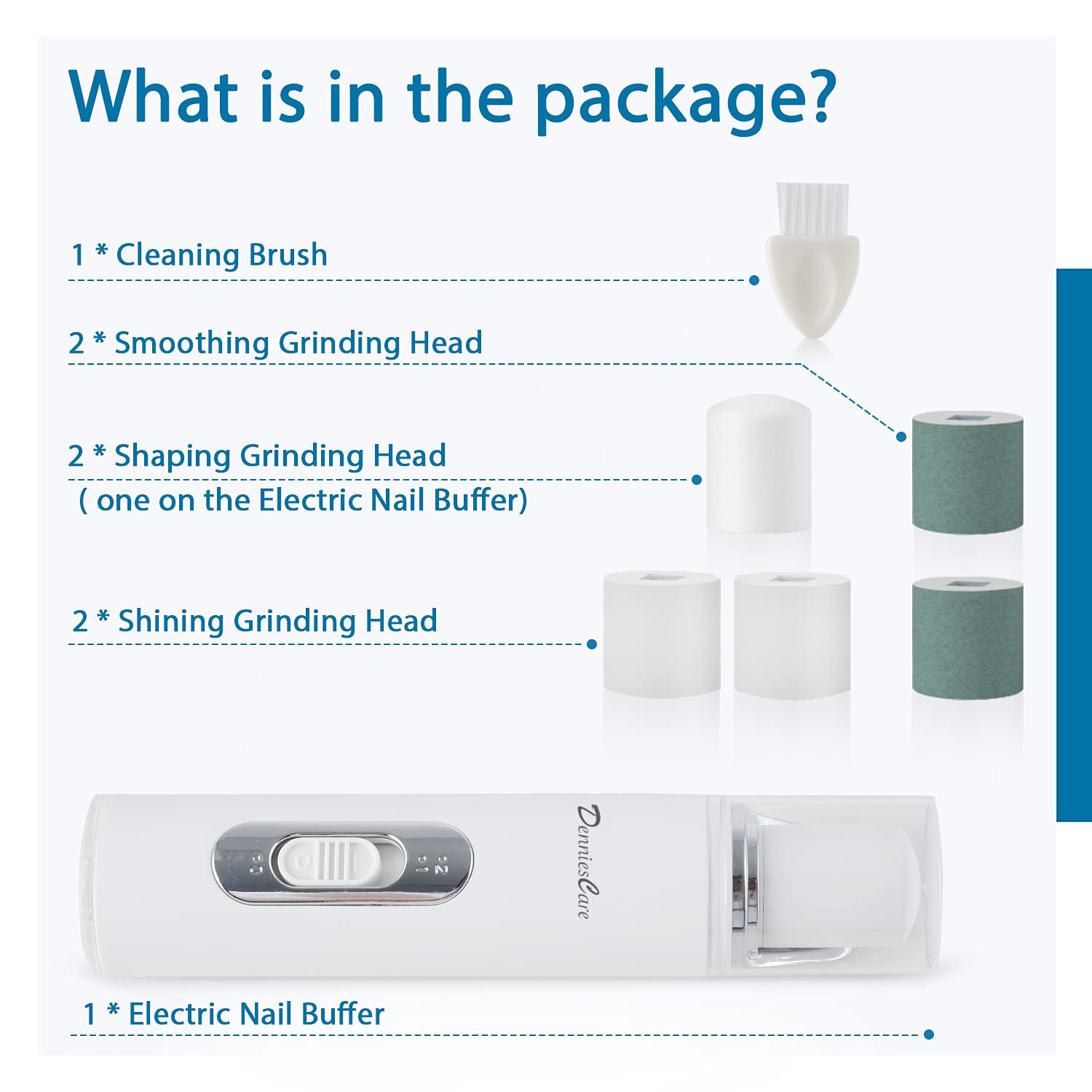 - Package Includes: One electric nail buffer, one USB cable, one shaping grinding head, two smoothing grinding Head, two shining grinding head, one cleaning brush and one product manual