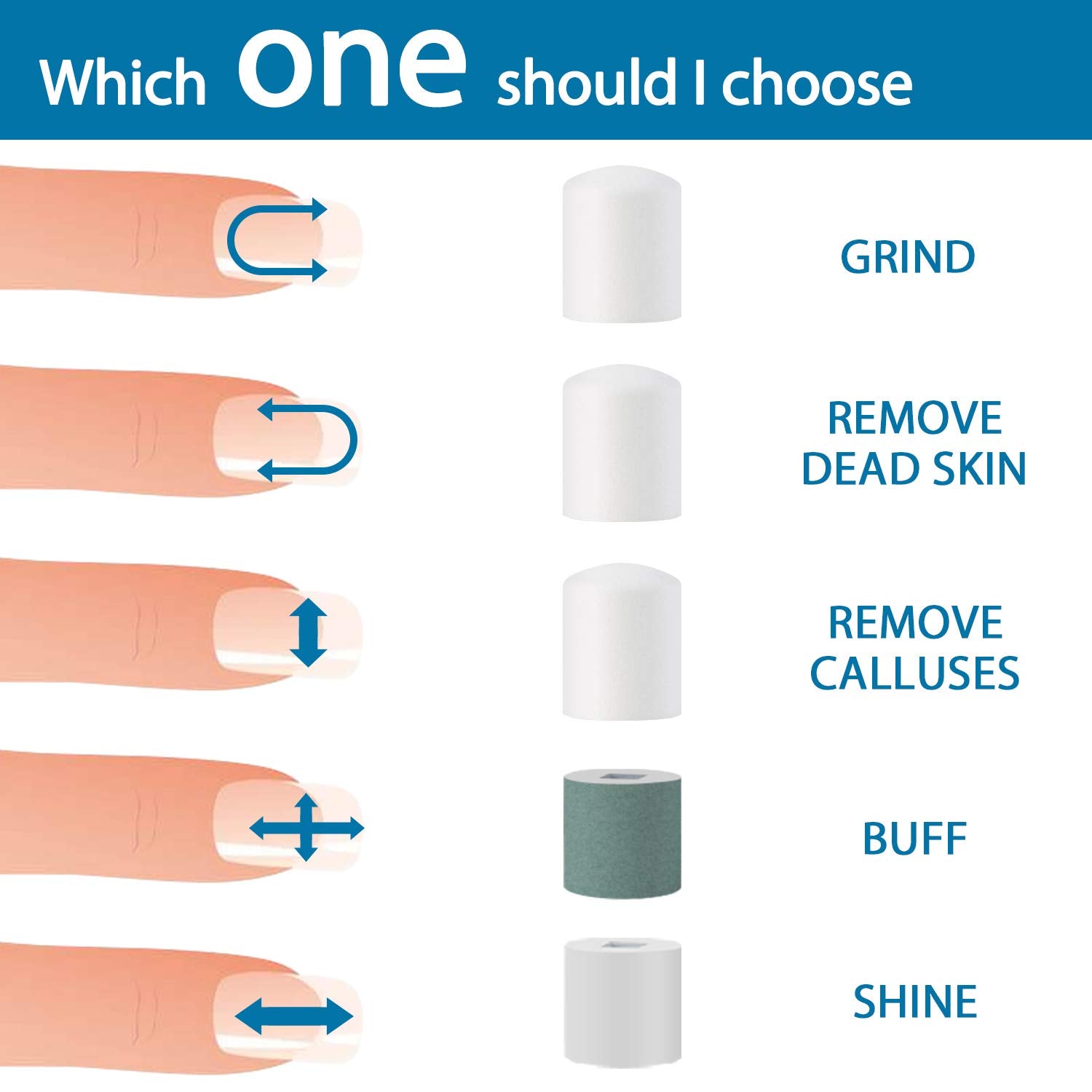 Six manicuring grinding heads (three functions) for you to choose from, makes grooming of nails more cost-effective.