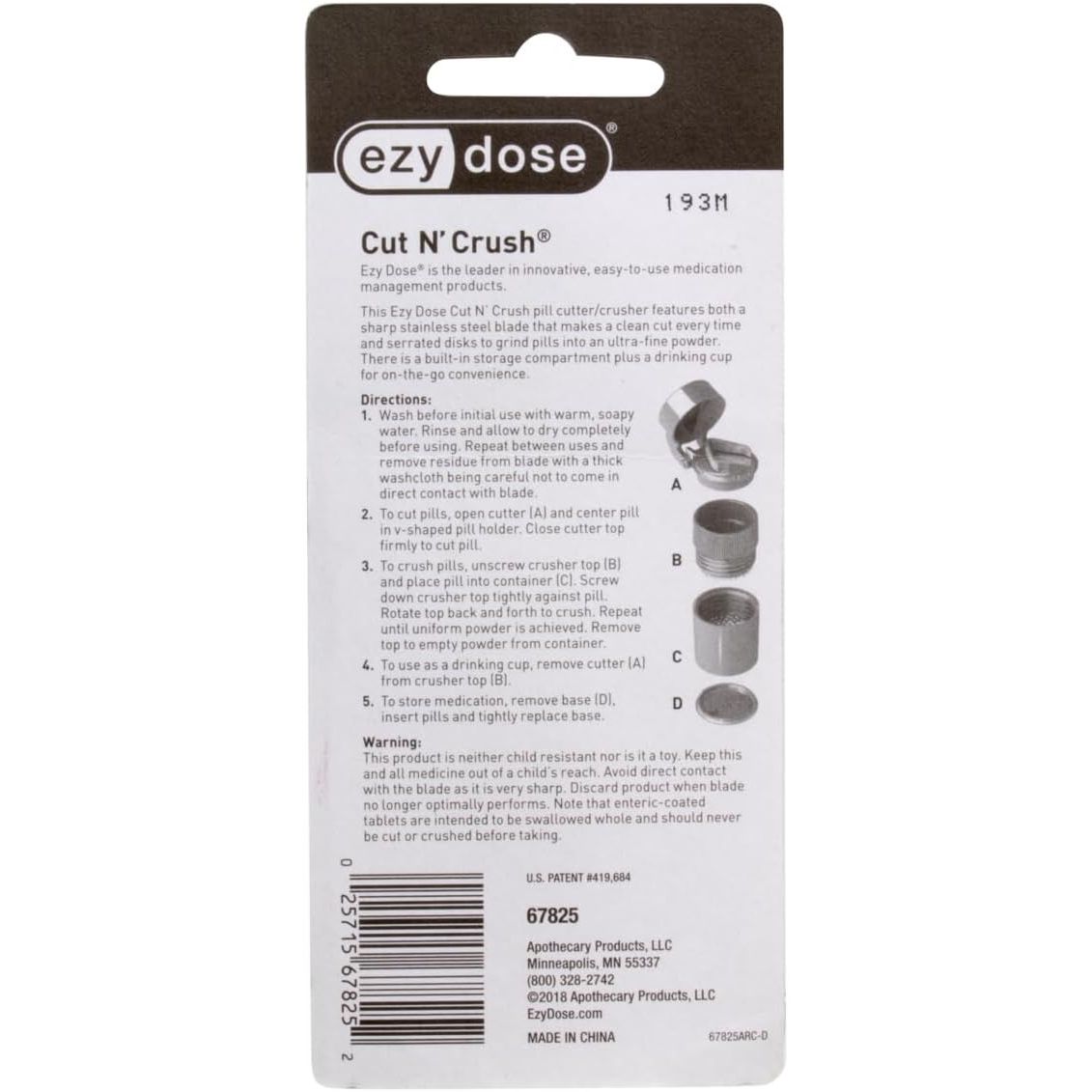 Ezy Dose Ultra Fine Cut N' Crush cutter and crusher combo stores, cuts and crushes medications and vitamins. Additionally, it provides an on-the-go drinking cup for convenient medication compliance with trickier medications that can't be taken whole.