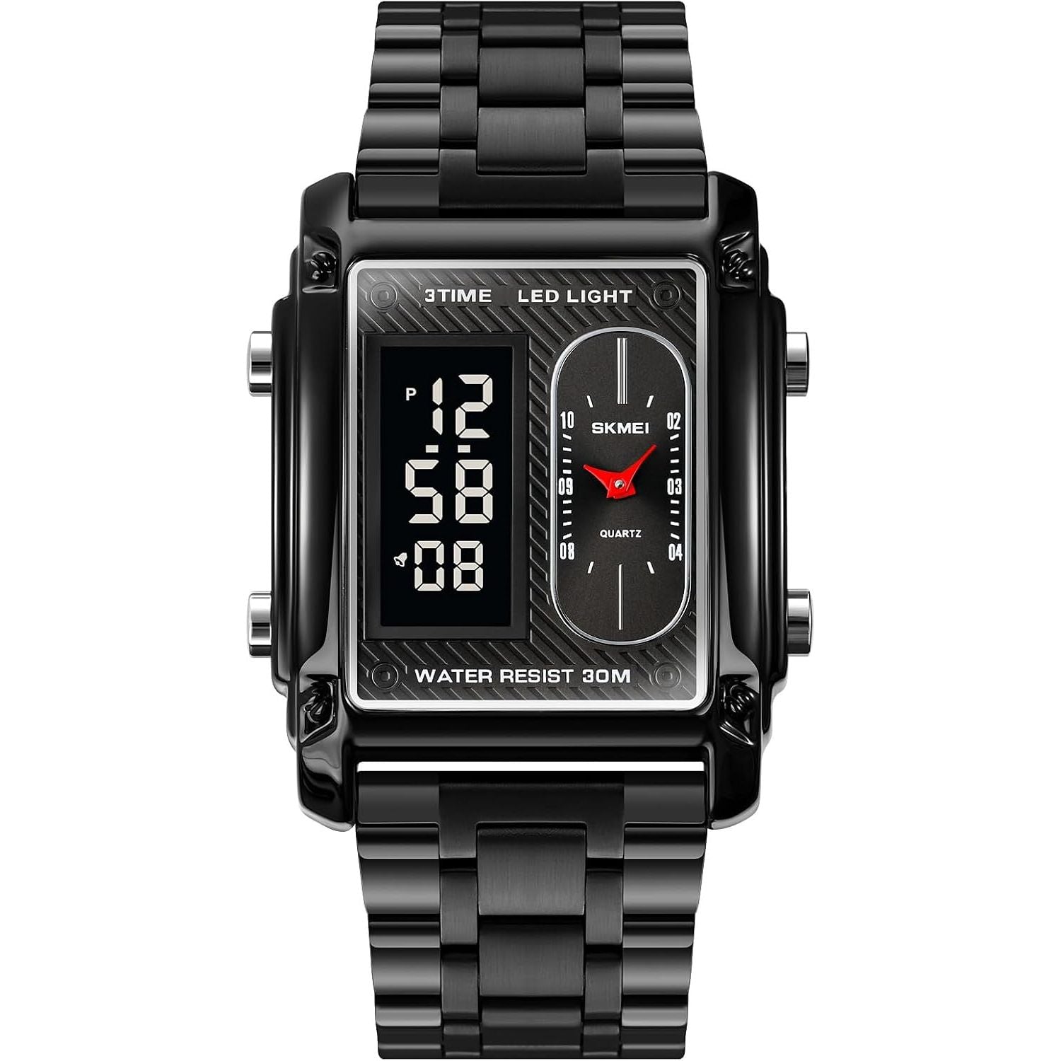 • Multi-functions: stopwatch, alarm, dual time zones, hourly chime, backlight, calendar, dustproof. It is a 'simulated' analog display with a digital clock on the bottom. It's unique design is eye-catching.