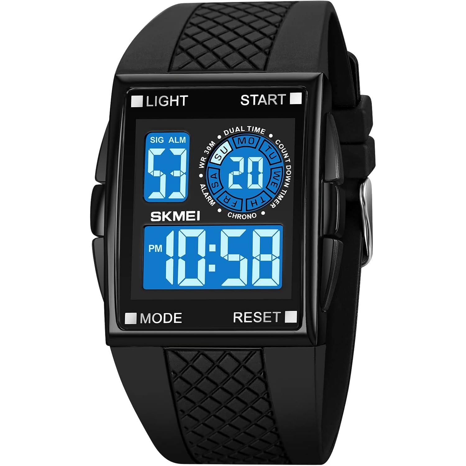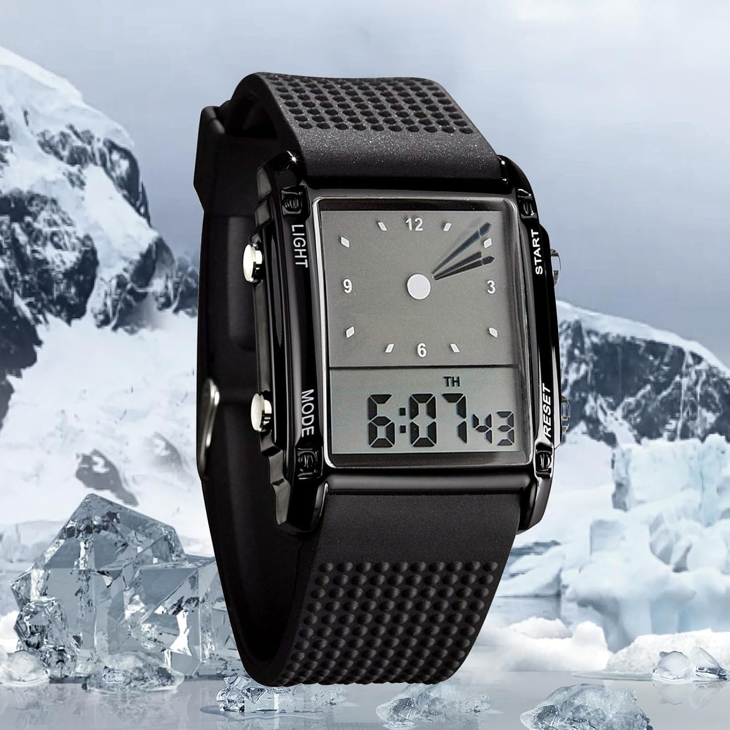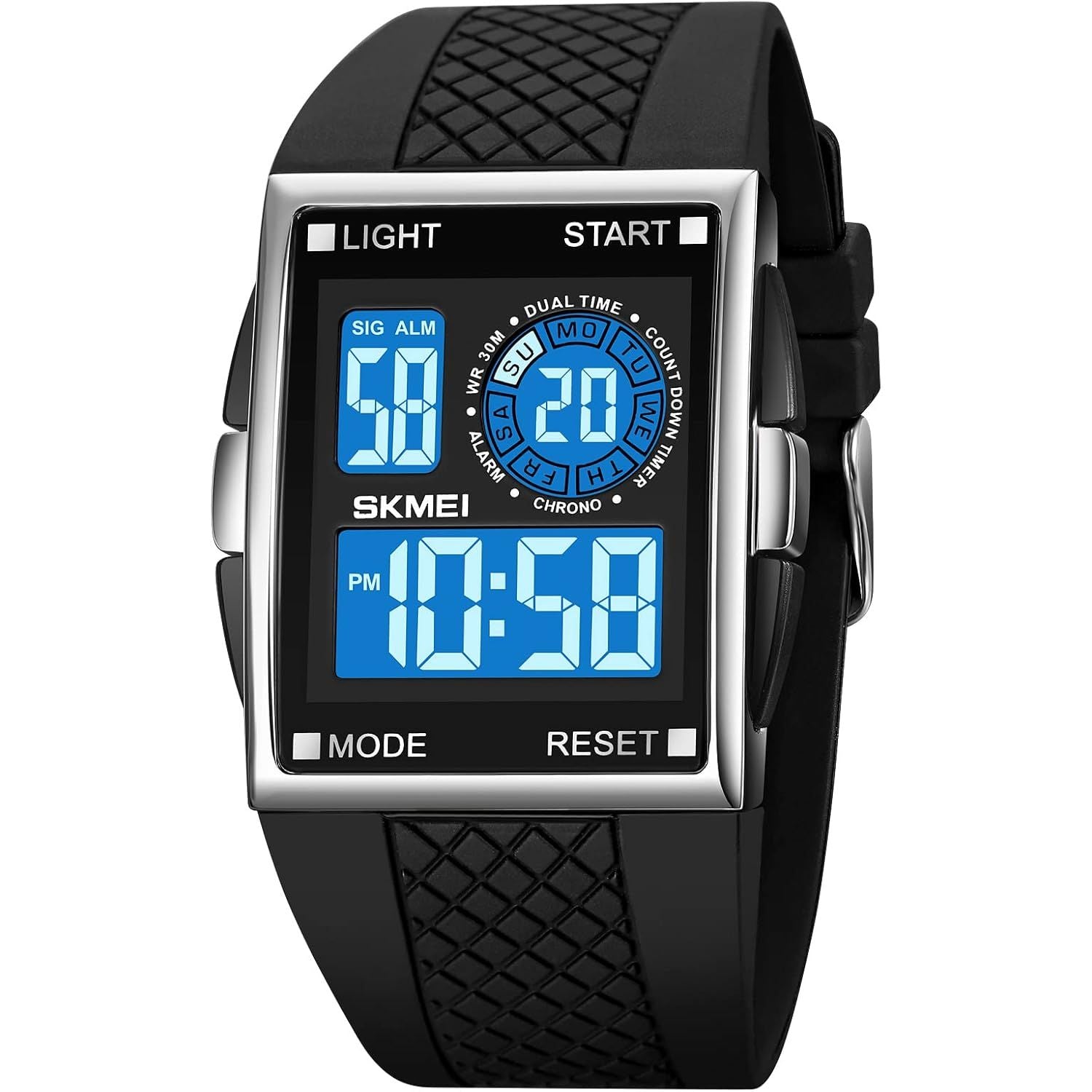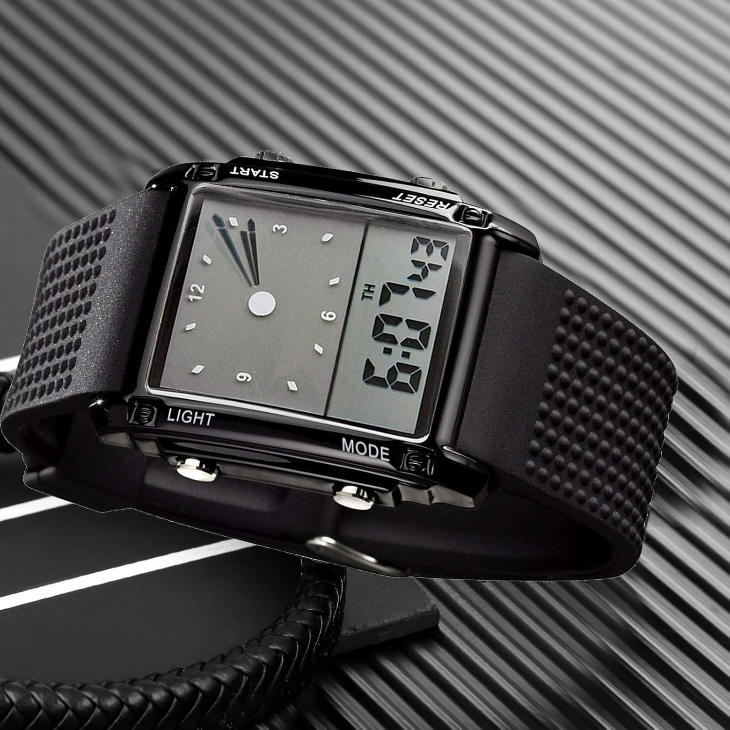 FANMIS Men's Rectangle Dial Sports Wrist Watches with 7 Colors Optional LED Backlight Multifunctional Alarm Stopwatch 12/24H Rubber Strap Watch