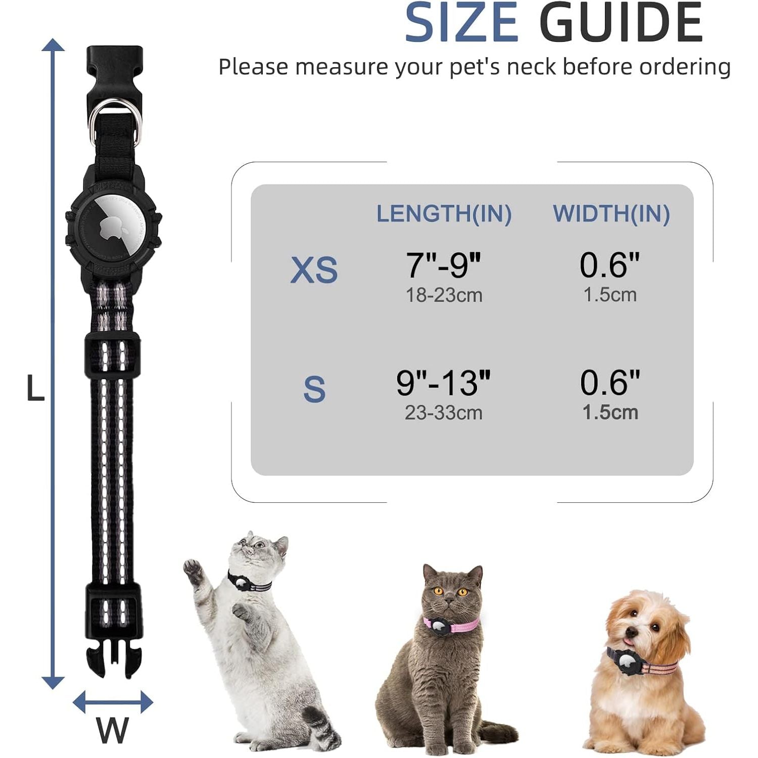 - [ADJUSTABLE IN 2 SIZES] FEEYAR AirTag cat collars are available in 2 sizes (XS:7-9'', width 3/5'' S:9-13'', width 3/5'') This cat tracker collar is suitable for cats/kittens/puppies/small dogs. Not recommended if your pet's neck circumference is larger than 13 inches.