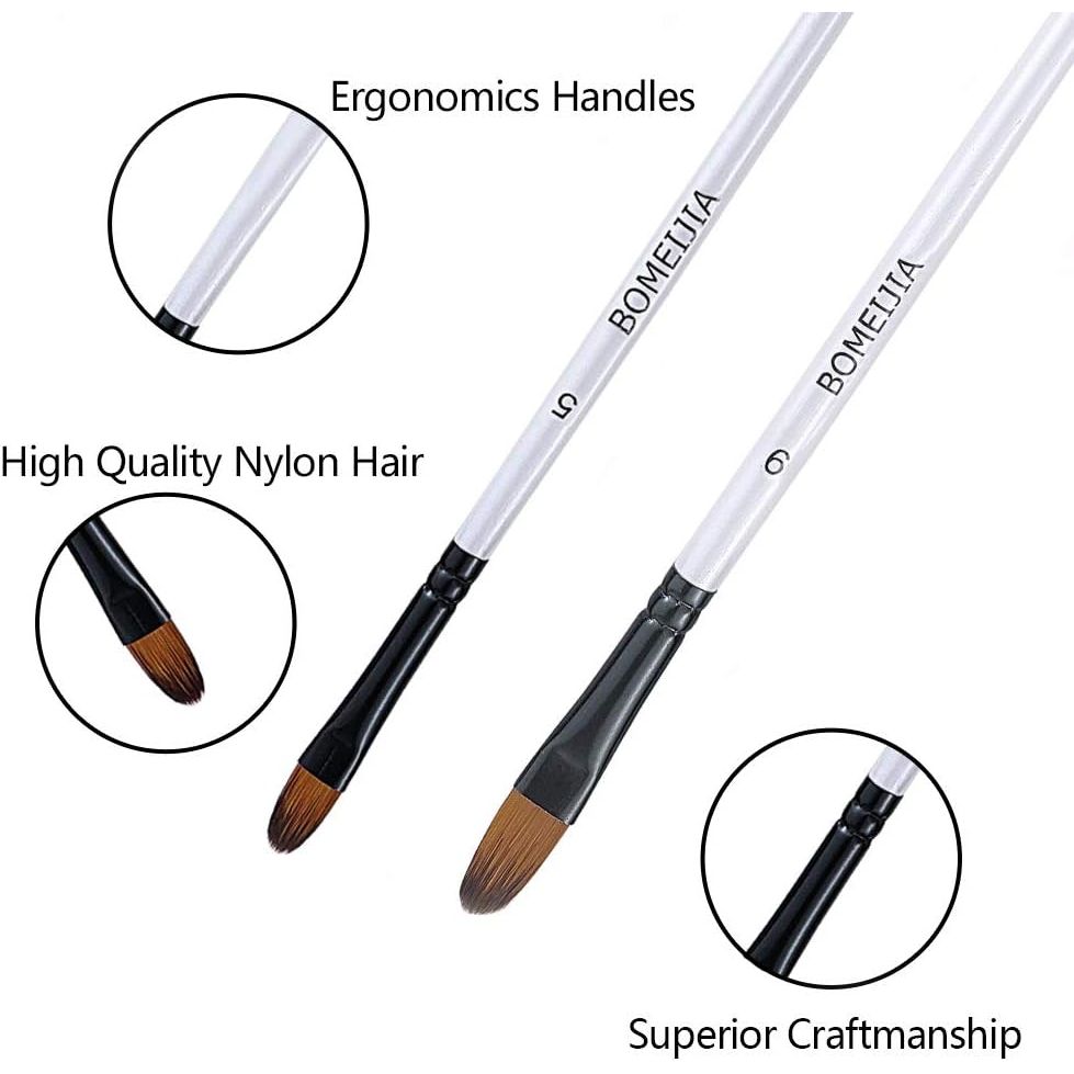 - FILBERT SHAPE NYLON PAINT BRUSHES: The artist filbert head brushes are made of finest quality of soft synthetic bristles with white short wooden handles.