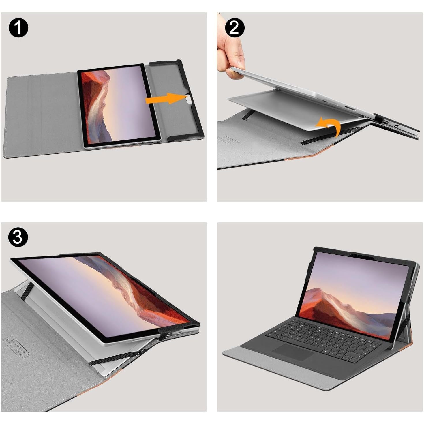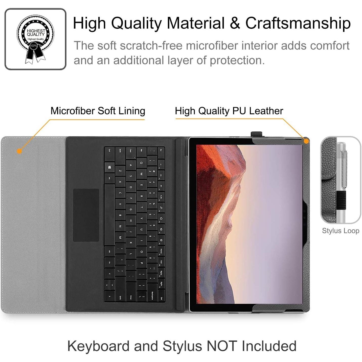 This case is designed for Microsoft Surface Pro 7+ (2021) / Surface Pro 7 (2019) 12.3-inch Tablet, compatible with Surface Pro 6 (2018) / Surface Pro 5th Gen (2017) / Surface Pro 4 / Surface Pro 3. This Fintie Built-in Kickstand with Multi-Angle Viewing Case for Microsoft Surface Pro 7 Plus/7/6/5/4/3 tablet is a must have and perfect companion for an easy and enjoying life! This case sports a simple and classy design made from premium synthetic leather, and the interior is lined with non-scratch material so you don't need to worry about any damages. Because the built-in kickstand of Microsoft Surface Pro you can adjust the case into a comfortable viewing, this capability allows the viewer to use the Microsoft Surface Pro 7 Plus / Pro 7 / Pro 6 / Pro 5 / Pro 4 / Pro 3 hands-free whatever your position may be without strain. All features of the Microsoft Surface Pro tablet are accessible even with the case on. Colors shown in pictures may slightly differ from actual product due to lighting and color settings on your computer. Available in a variety of bright and fun colors. Package Contents: 1 x Surface Pro Case Only (Tablet, Keyboard and Stylus in the pictures are NOT included!)