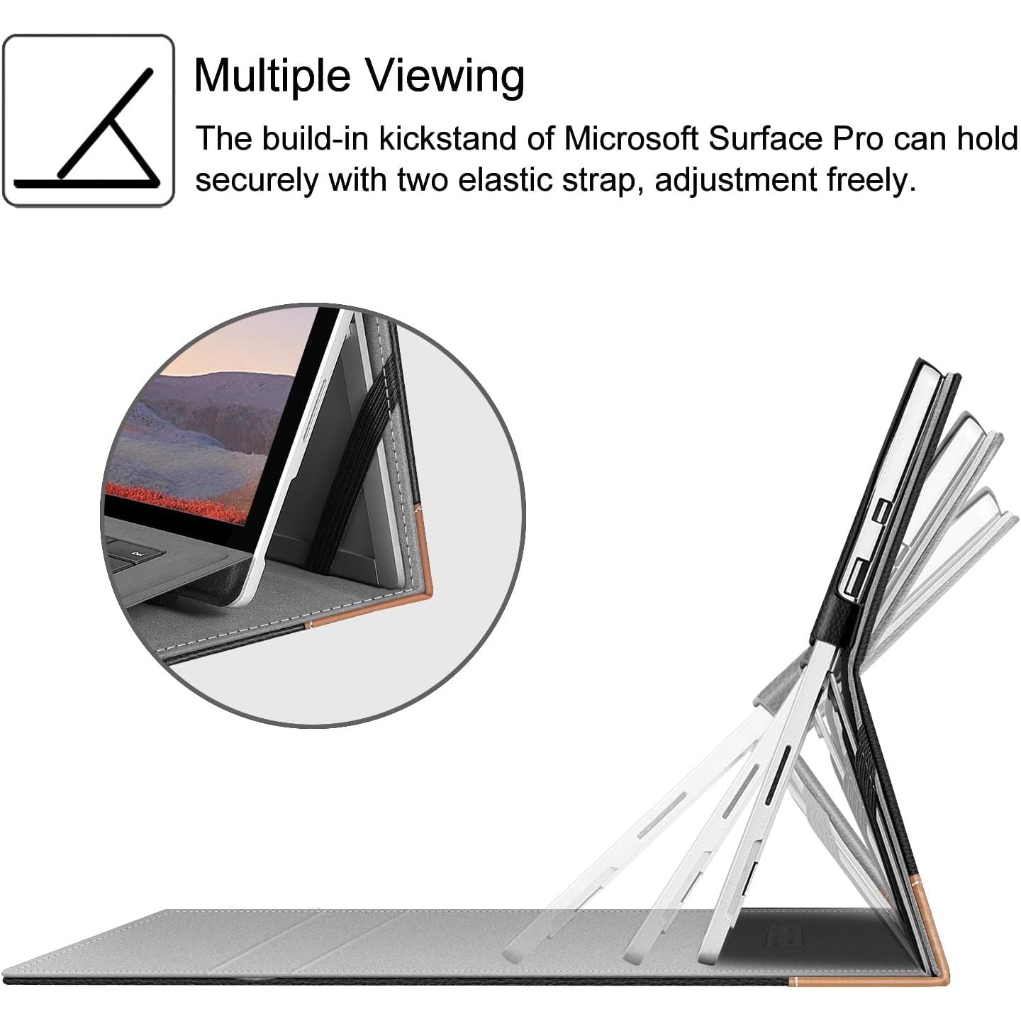 - Unique design ensures Microsoft Surface Pro original built-in kickstand to be used at will for multi-viewing angles. Extra Pocket allows to store small items such as business card or usb charging cable if in need.
