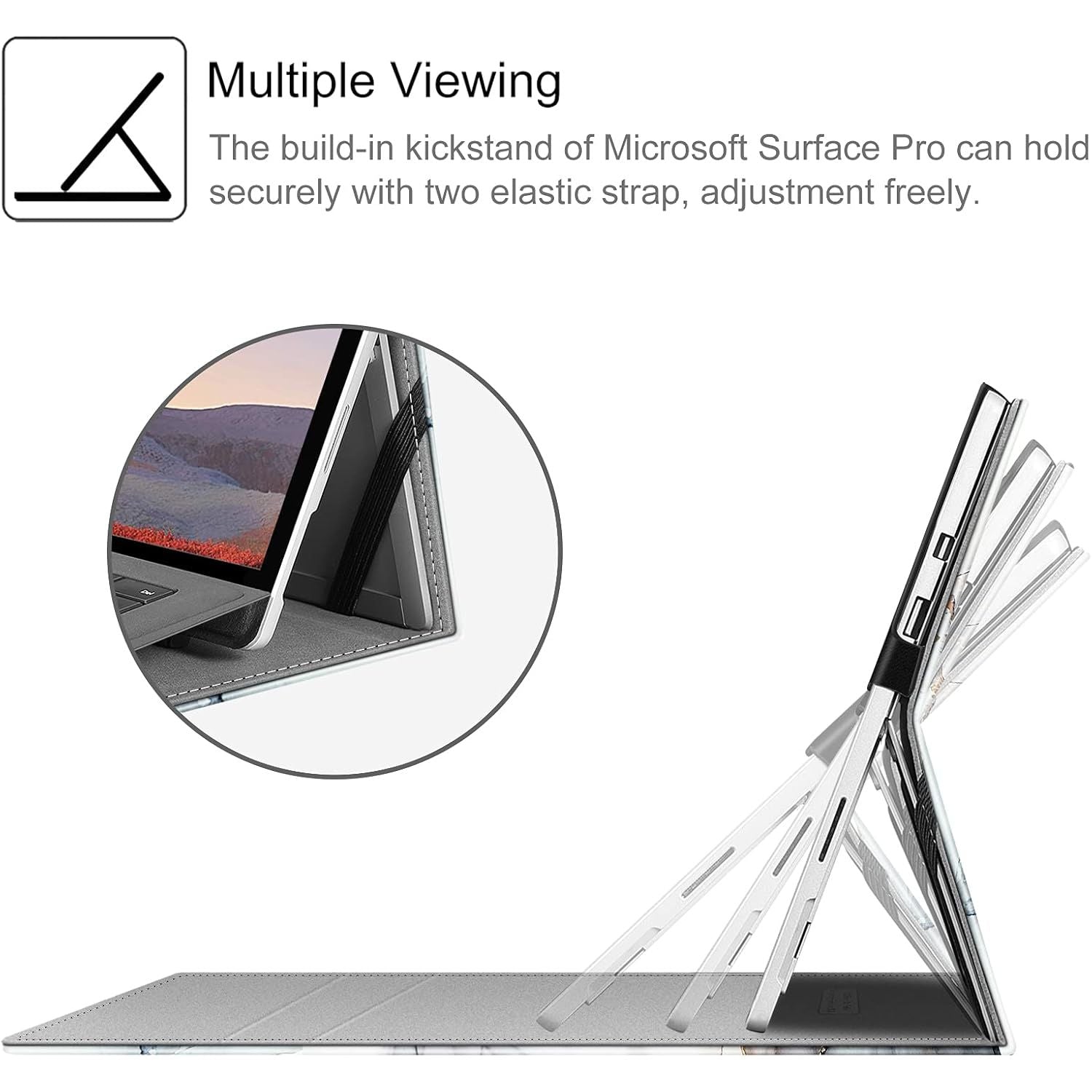 - Unique design ensures Microsoft Surface Pro original built-in kickstand to be used at will for multi-viewing angles. Extra Pocket allows to store small items such as business card or usb charging cable if in need.