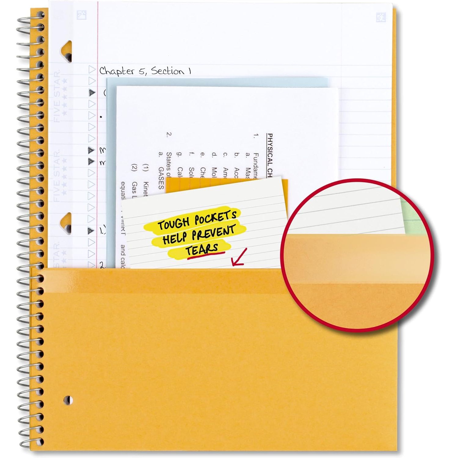 LASTS ALL YEAR. GUARANTEED! Scan, study and organize your notes with the Five Star Study App. Create instant flashcards and sync your notes to Google Drive to access them anywhere from any device. This Five Star 5 subject notebook has 200 double-sided, college ruled sheets for organized notetaking. The sheets fight ink bleed and are perforated for quick and easy tear out. The sheets measure 8-1/2" x 11" when torn out. Tough pockets help prevent tears and hold 8-1/2" x 11" loose sheets, handouts and more. Durable plastic front cover is water-resistant to help protect your notes all year long, while Spiral Lock wire helps prevent snags on clothes and backpacks. The notebook pages are made with SFI certified paper. This notebook is recyclable – just remove the reinforcement tape on the pocket and recycle the rest! Available in Amethyst Purple. Guarantee is valid for one year from purchase or delivery date, whichever is longer. Does not cover misuse.