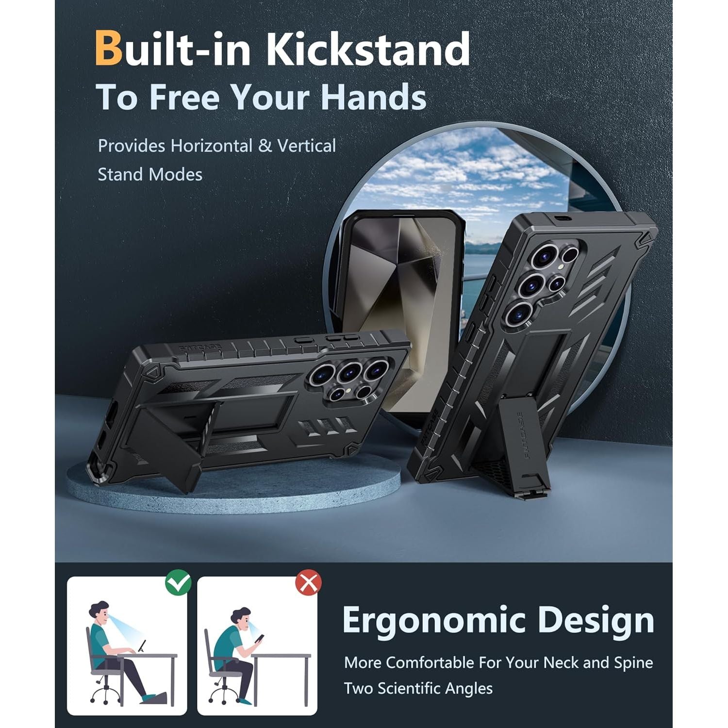 - Built-In Kickstand: This Galaxy S24 Ultra case with a stand works perfectly both in vertical and horizontal positions. Convenient for reading, watching movies, playing games, browsing the web, and face-to-face chatting with friends.Provides hands-free portrait and landscape viewing angles.