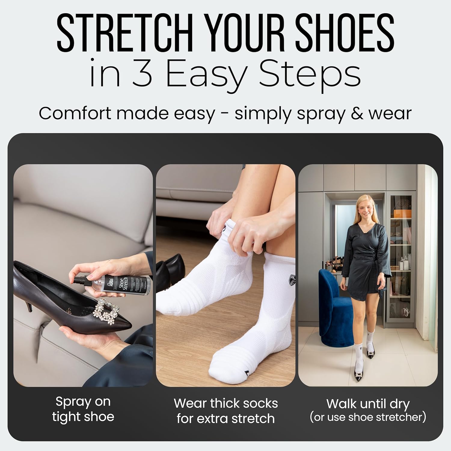 - Easy To Use: Shake the bottle, spray generously on the area you want to expand (inside and outside), put on your thickest pair of socks, immediately wear your boots or shoes, and walk around in them till dry. Repeat as needed. You can also use a shoe stretcher overnight instead of wearing the shoes after application