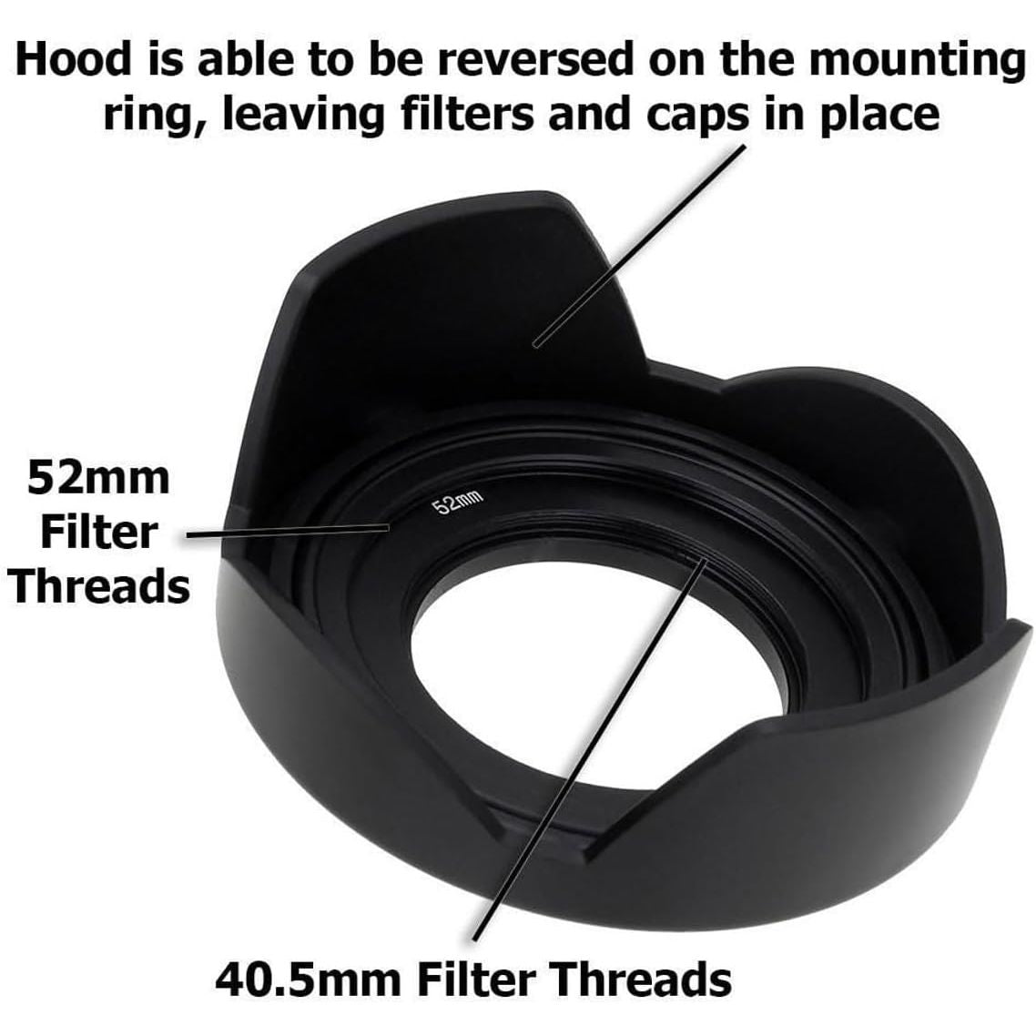 This reversible, flower style, lens hood helps prevent lens flare and reduces sun glare by extending and shading the front lens element from exposure. The mounting ring attaches directly to the lens, the hood snaps onto the ring which also provides access to both the original 40.5mm filter threads as well as larger 52mm filter threads. The hood is detachable from the mounting ring and reversible for storage, leaving any filters and caps in place on the lens regardless of the hood orientation. This allows you to use the original Sony lens cap or the larger lens cap included in the kit as well as leaving protection filters in place no matter which way the hood is attached. Lens hoods are primarily designed to prevent unwanted stray light from entering the lens by extending and shading the end of the lens. In addition, since the end of the lens is extended, you also get the added benefit of some extra protection from accidental impact. This lens hood maximizes the amount of hood coverage for the minimum amount of weight and hood area because of its flower shape. Kit Includes: Reversible Flower Hood 40.5/52mm Mounting Ring 52mm Inner Pinch Lens Cap