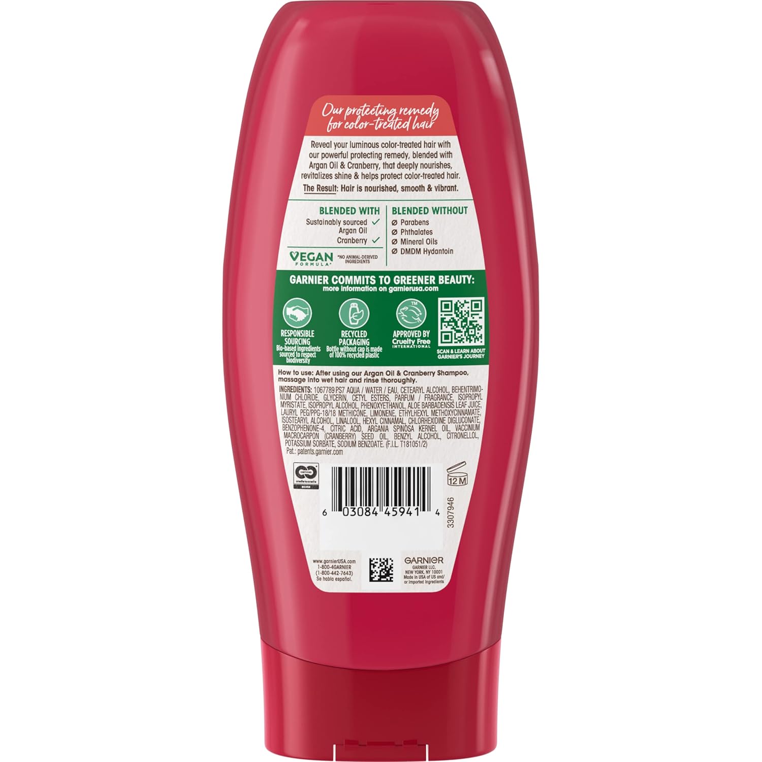 Our color-protecting formula, blooms with a vibrant fragrance of Argan oil and cranberry, bringing to life our wholesome care that protects color & enhances radiance. When using the Garnier Whole Blends Color Care system of shampoo & conditioner. • Color Care Conditioner protects color and reveals radiance for color-treated hair • Conditioner Formula with Argan Oil sustainably sourced from Morocco and North American cranberry extracts • Enriched with a Natural Blend, Paraben-Free • Gentle for everyday use After shampooing, apply a generous amount of conditioner to hair from root to tip. Gently work through hair, then rinse. For extra care, indulge in our Color Care mask treatment.
