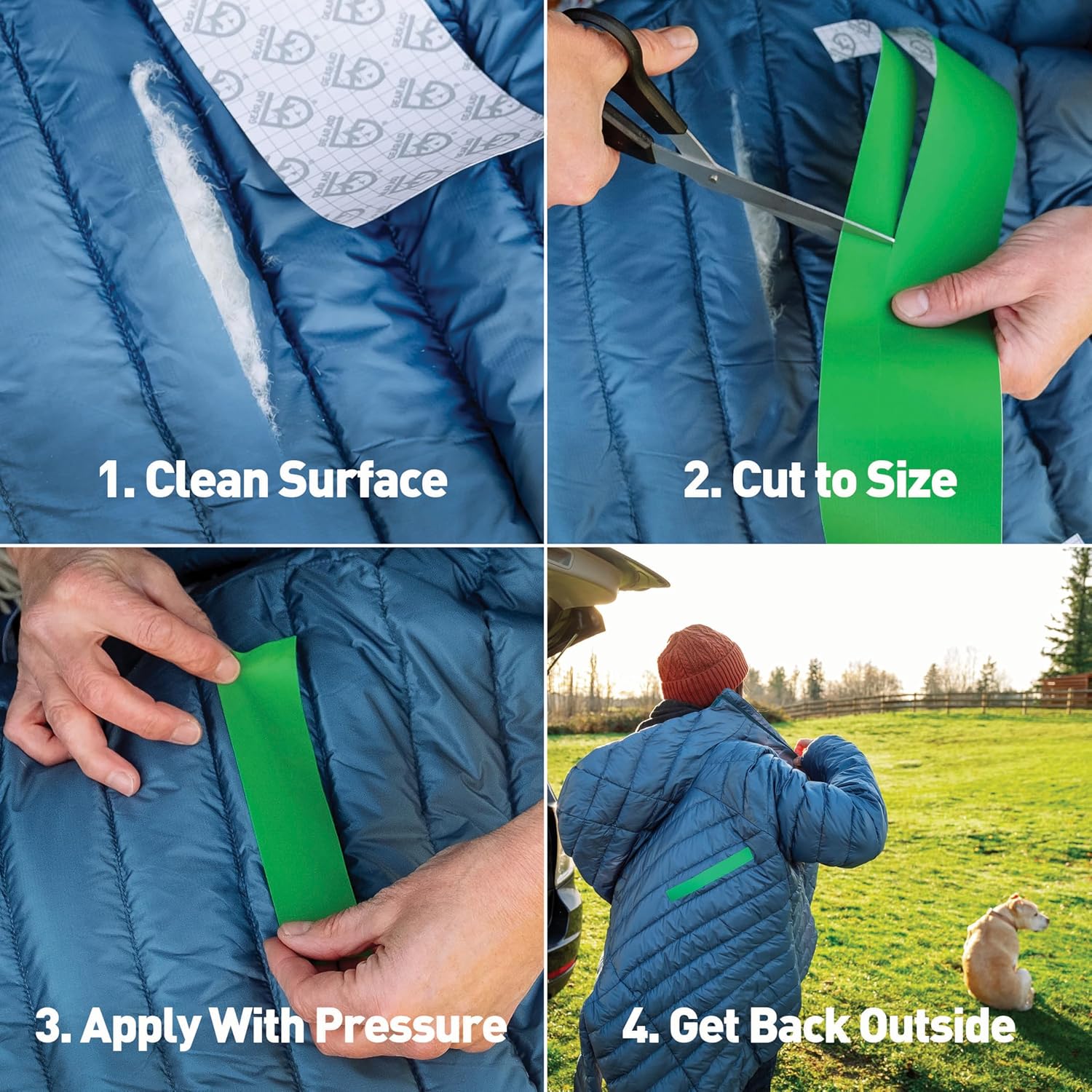 - Fix rips and holes fast with an ultra-strong, peel-and-stick repair tape that requires no heat or sewing, ideal for use on tents, tarps, jackets, vinyl furniture, and other synthetic materials