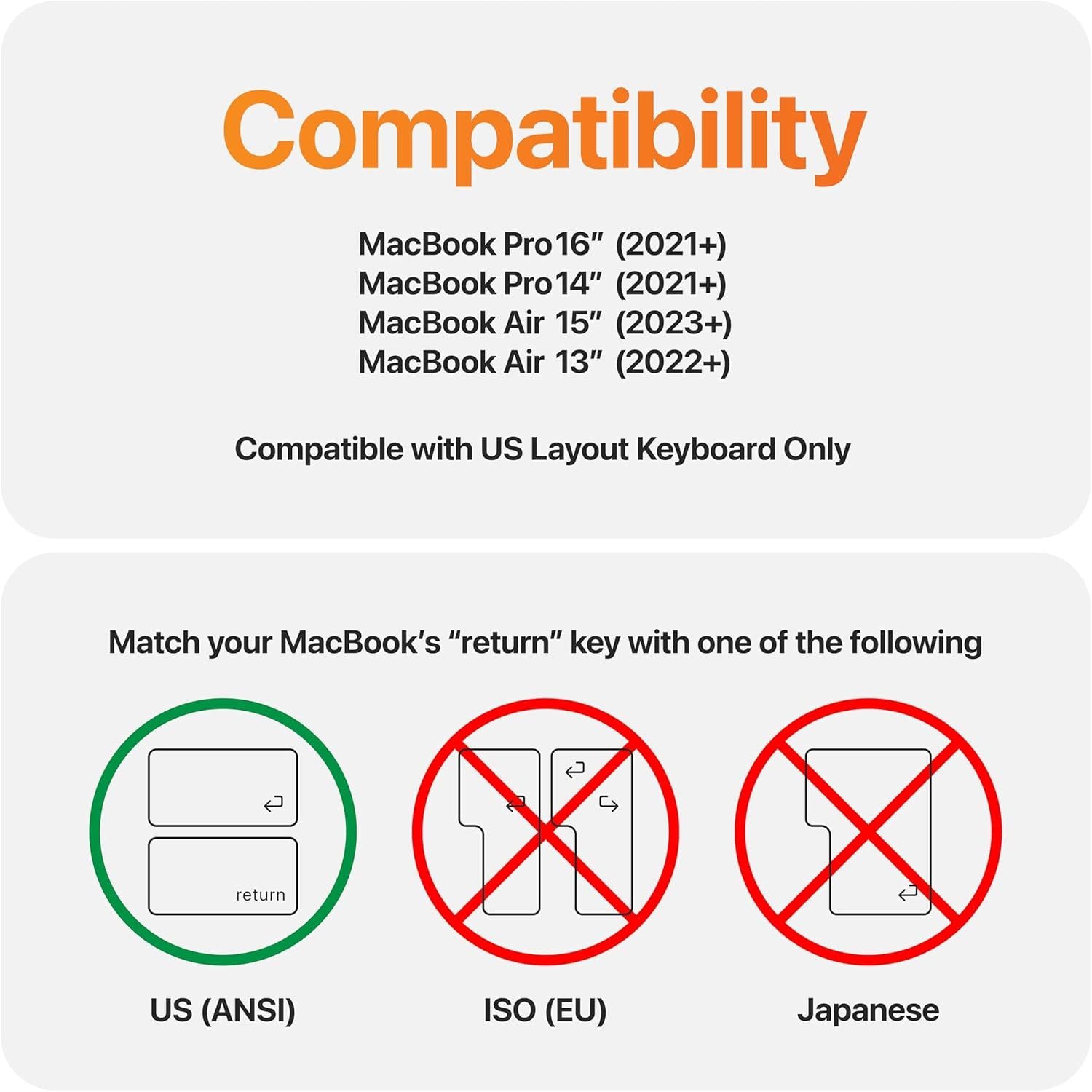 - Designed for 2021+ Apple Silicon M1/M2/M3/M4 Pro/Max MacBook Pro 14"/16", 2022+ M2/M3/M4 MacBook Air 13"/15", US Keyboard Layout Only