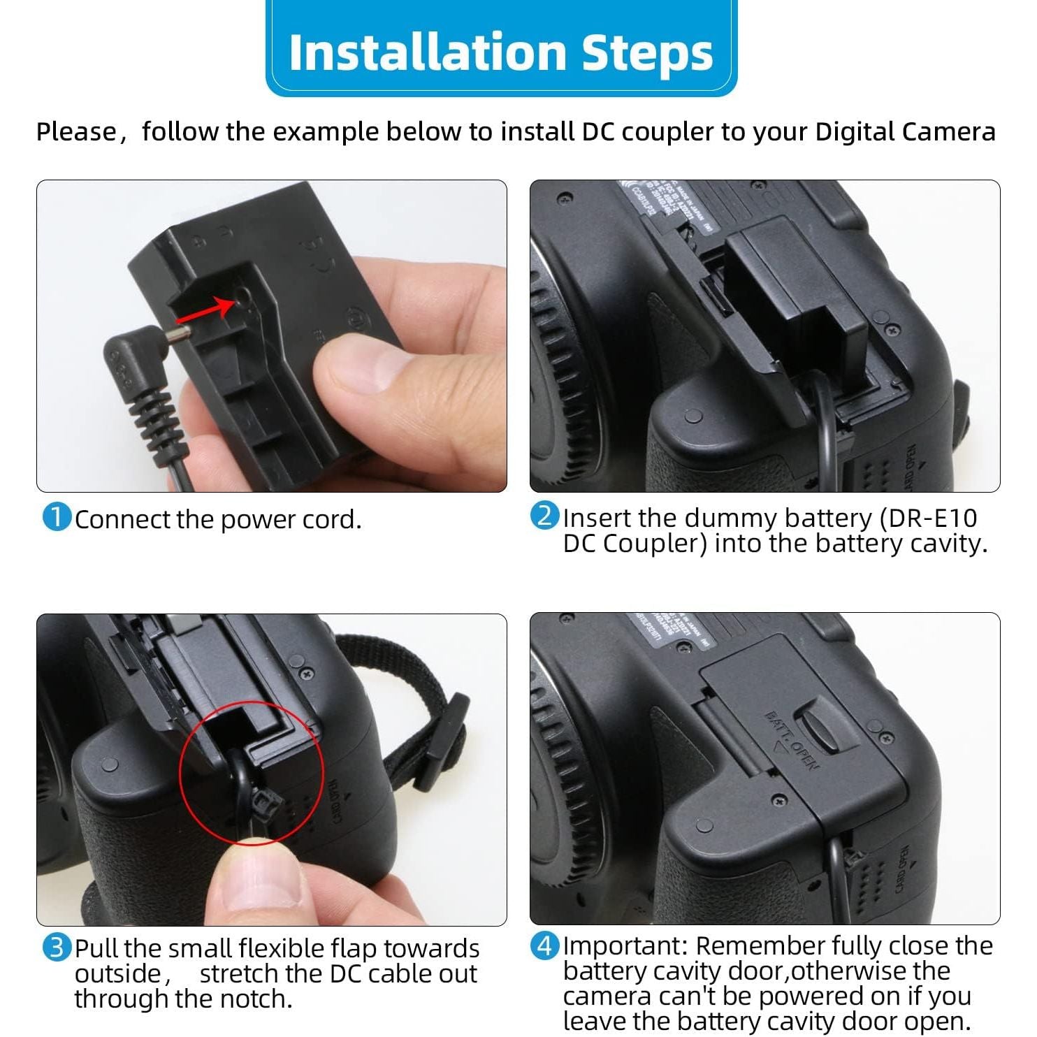 - 【Function】DR-E10 DC Coupler kit replaces the LP-E10 camera battery and connects to an ac adaptor to power your camera from an AC outlet. Useful for lengthy studio shoots with no need to continuously replace and recharge multiple batteries.