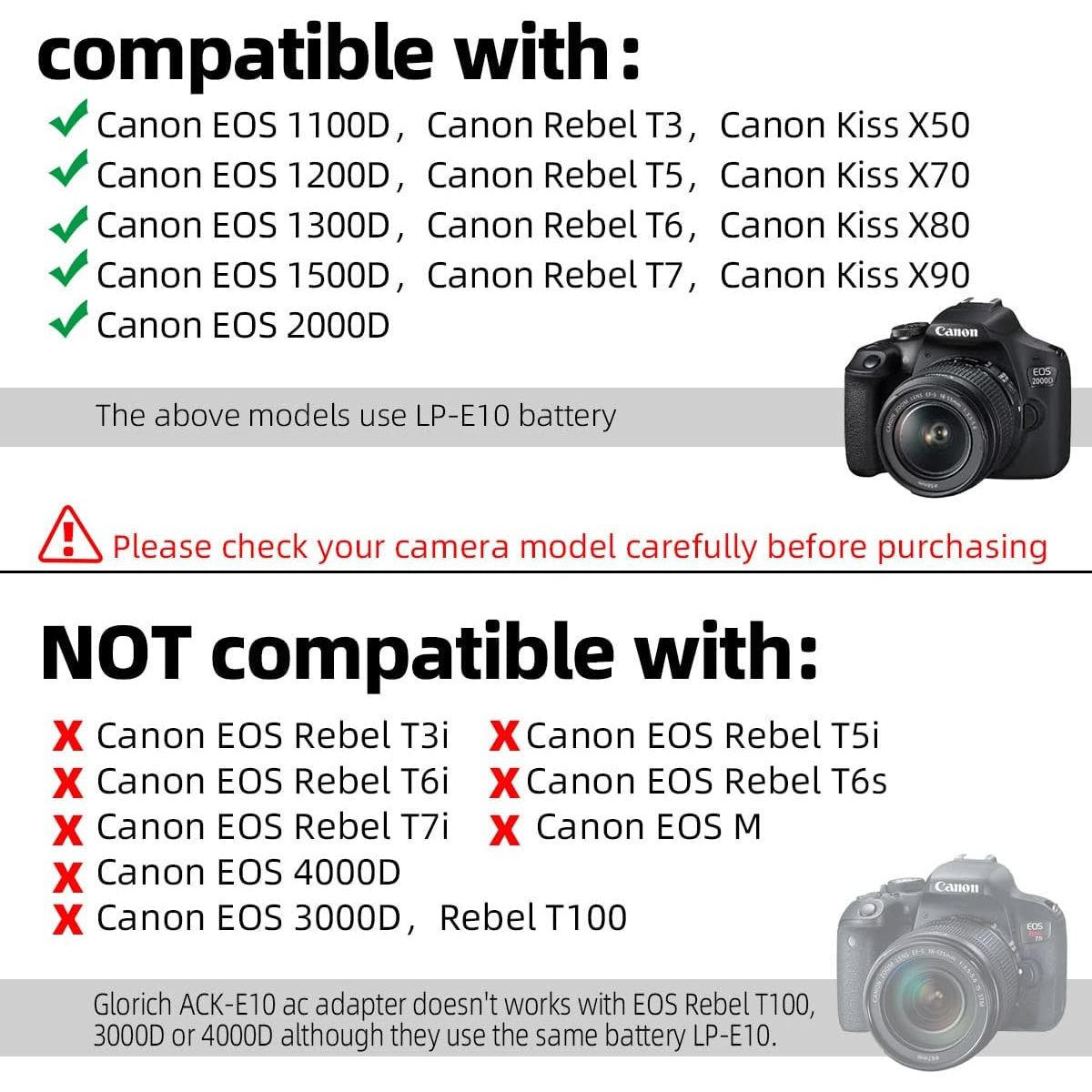 - 【Compatible Models】Glorich ACK-E10 AC Power Adapter DR-E10 DC Coupler LP-E10 Dummy Battery Power Supply Kit Compatible with Cameras Canon EOS 1100D 1200D 1300D 1500D 2000D Rebel T3 T5 T6 T7 Kiss X50 X70 X80 X90. DISCLAIMER: This product is NOT compatible with Cameras Canon EOS M 4000D 3000D Rebel T100 T3i T5i T6i T6s T7i.