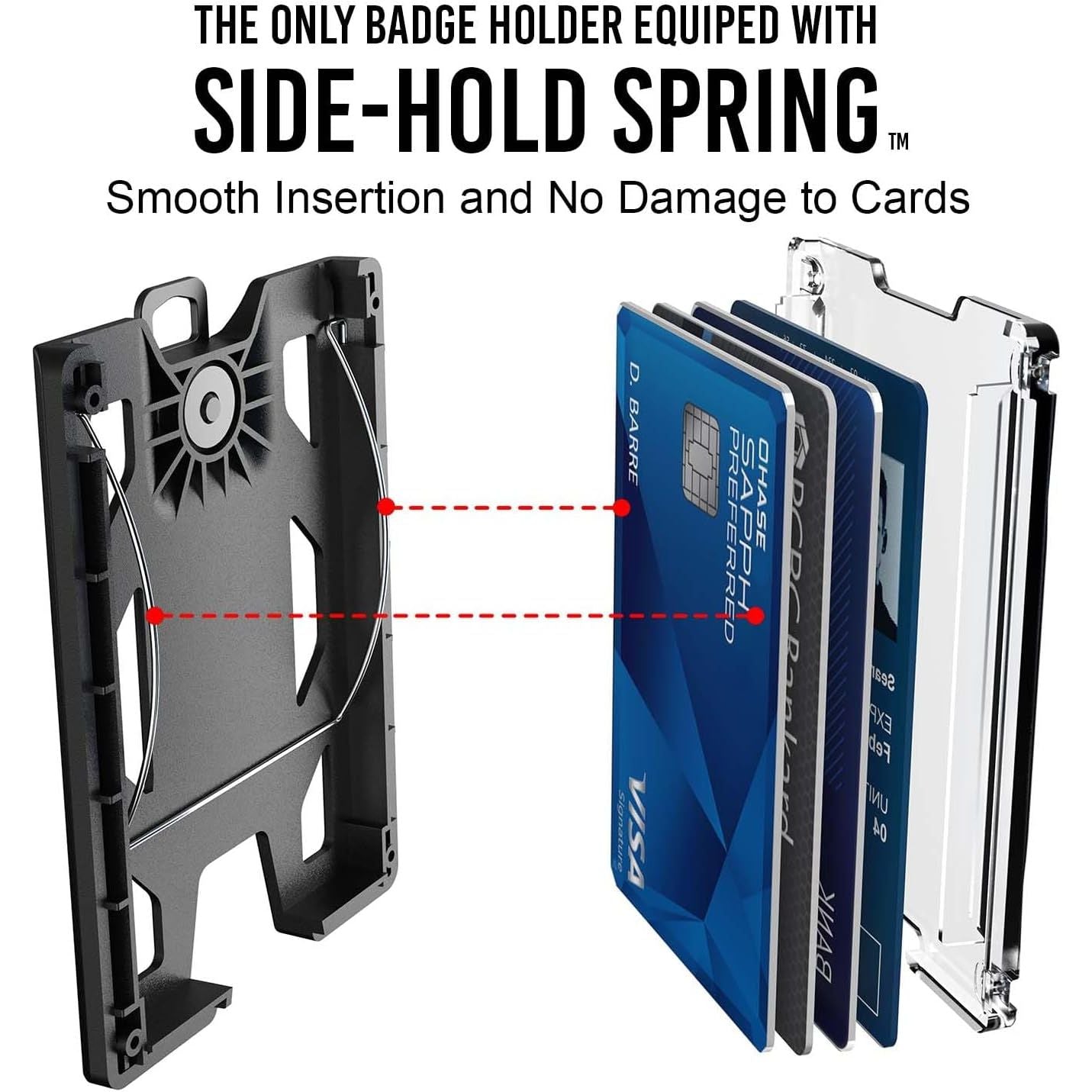 - PATENTED SPRING-LOADED CARD HOLDING SYSTEM: The only badge holder equipped with steel wire spring that holds cards well, whether loaded with 1 or 4 cards. Wire spring holds cards on the sides preventing damage to the front or back of your cards.