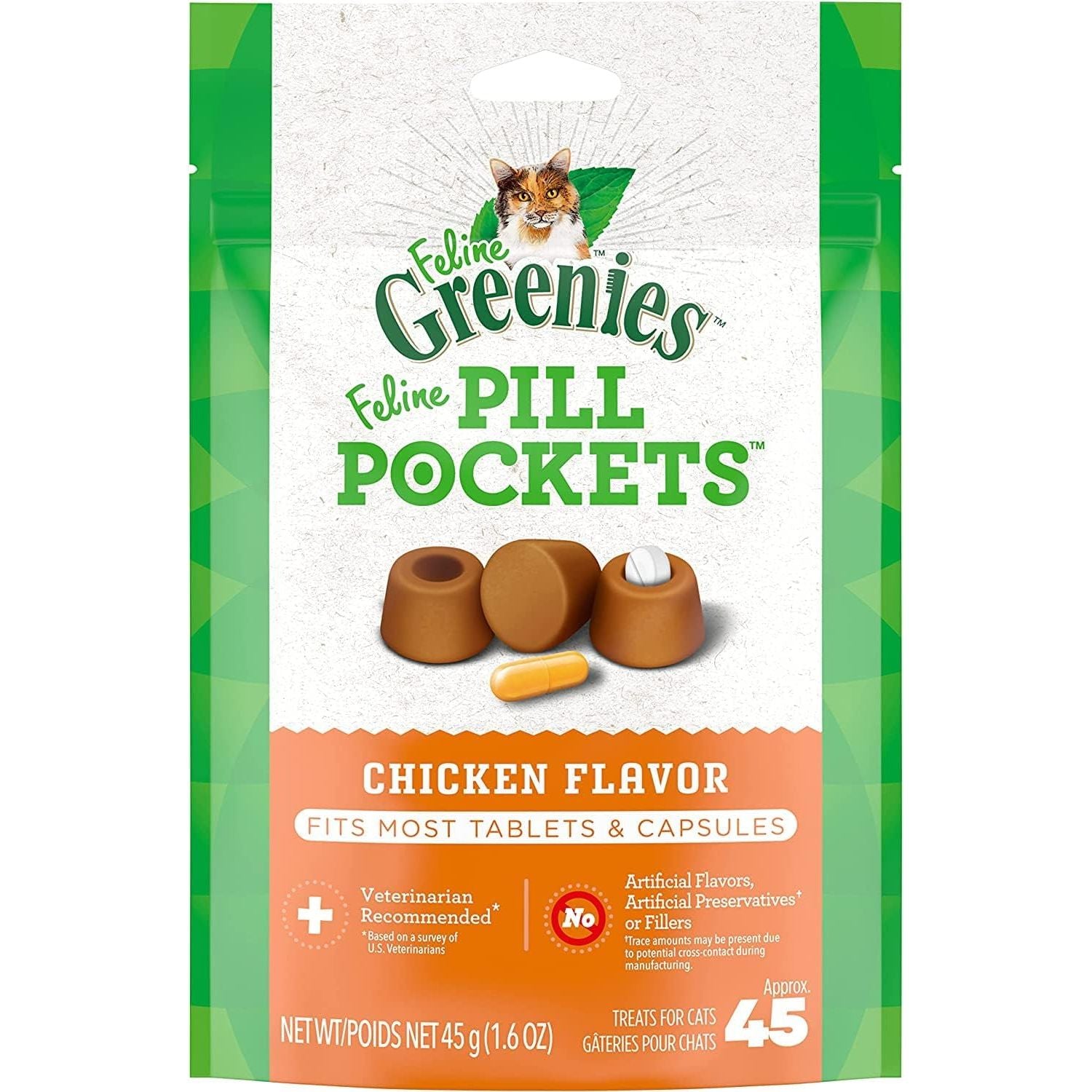 - Greenies Feline Pill Pockets for Cats Natural Soft Cat Treats, Chicken Flavor, 1.6 oz. Pouch (45 Treats)