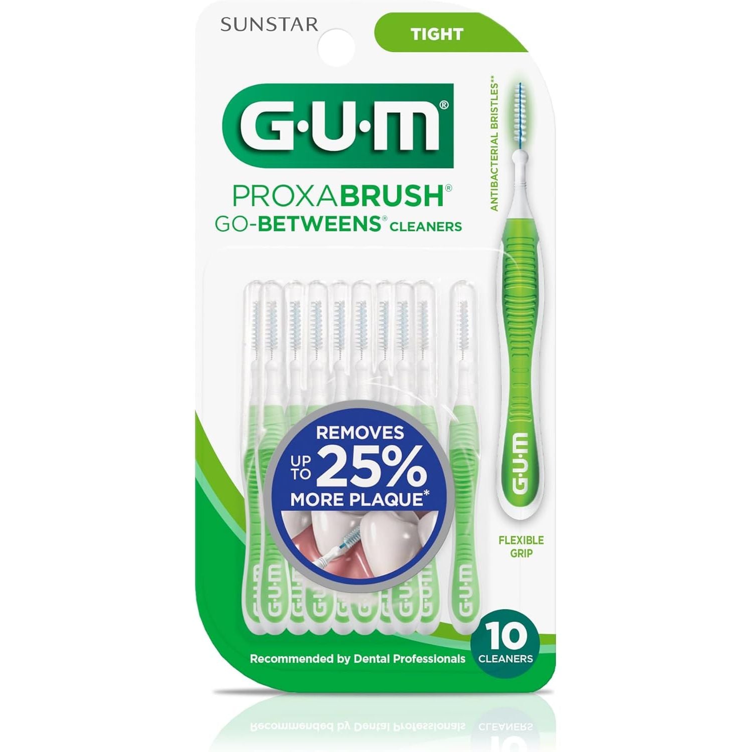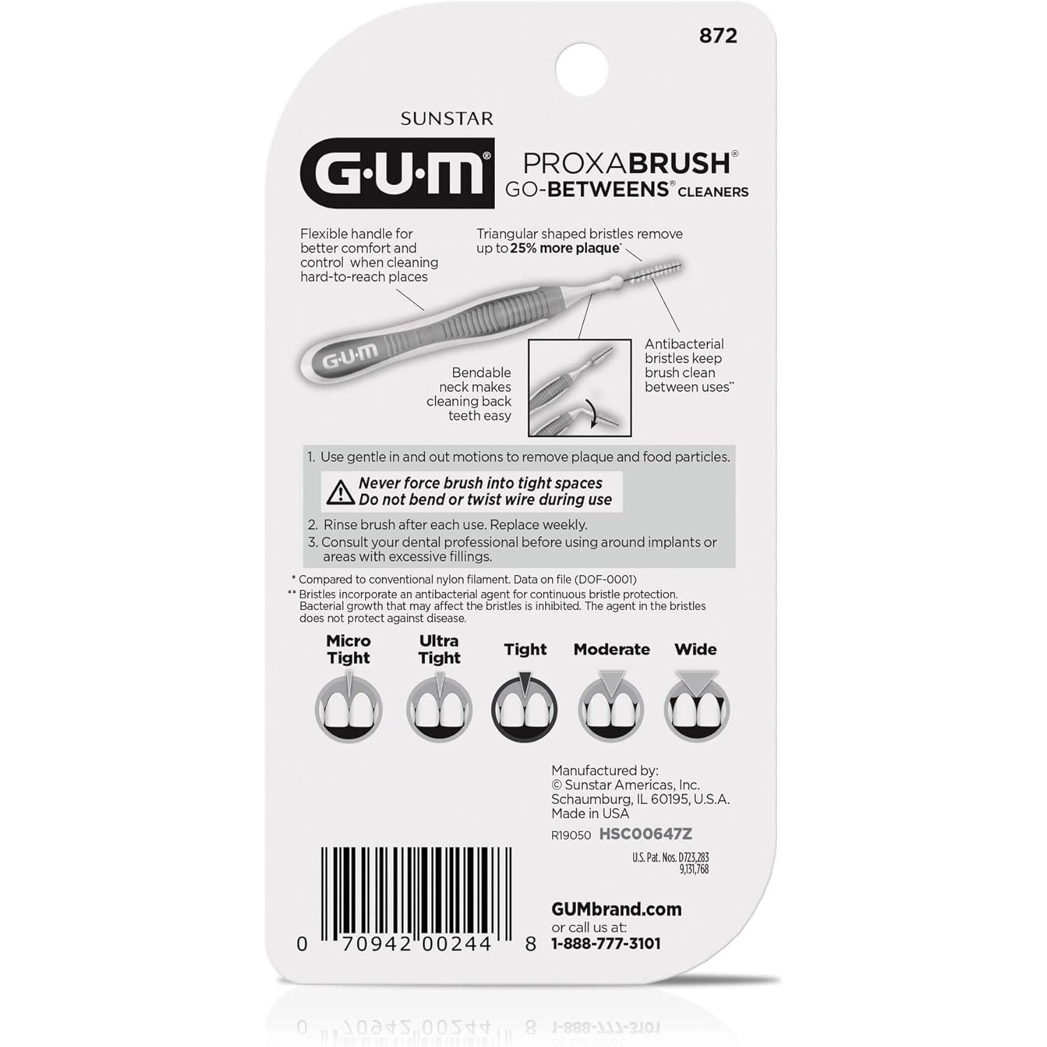 Product Description Go beyond brushing with GUM Proxabrush Go-Betweens. Between-teeth cleaning is essential for removing plaque from hard-to-reach areas that are missed by brushing alone....But tight teeth, difficulty gripping floss, and a simple lack of time prevent many of us from flossing as often as we should. Proxabrush Go-Betweens Interdental Cleaners are clinically designed by dental professionals to offer a quick, easy, and effective alternative to flossing. Our Tight reusable floss brushes are specifically made to remove plaque and food particles from tighter interdental spaces, the perfect braces cleaner. Each floss brush features coated bristles and a breathable travel cap that allows for up to ten days of use. With GUM Proxabrush Go-Betweens, cleaning the hard-to-reach areas in your mouth has never been easier. A non-slip rubber handle and bendable neck make it easy to maneuver to the back of the mouth while nylon coated wire cleans around braces, bridges, implants, and other dental devices without the risk of scratching or galvanic shock. Features : ● Designed for tight interdental spaces ● Triangular bristles for 25% more effective plaque removal* ● Nylon coated wire is a perfect braces brush for cleaning. ● Coated bristles and a breathable travel cap allow 10 days of use ● Non-slip rubber handle for easy grip ● Bendable neck for further reach Our dental brushes make it easy to carry a confident smile with you wherever you go. Different from flosser picks, each interdental brush features a compact, portable size that fits easily into purses, pockets, and travel kits for healthier gums, cleaner teeth, and fresher breath anytime, anywhere. *vs DOF-0001 Manufacturer Contact Information ....
