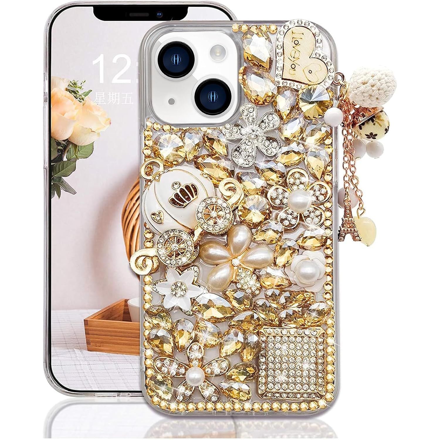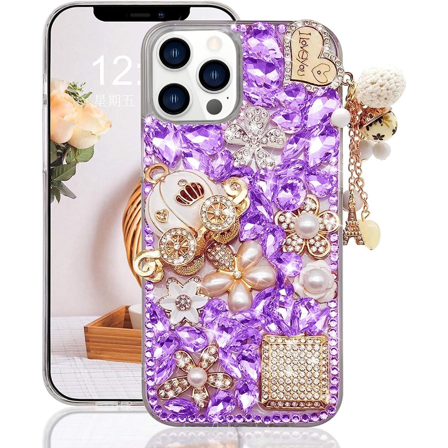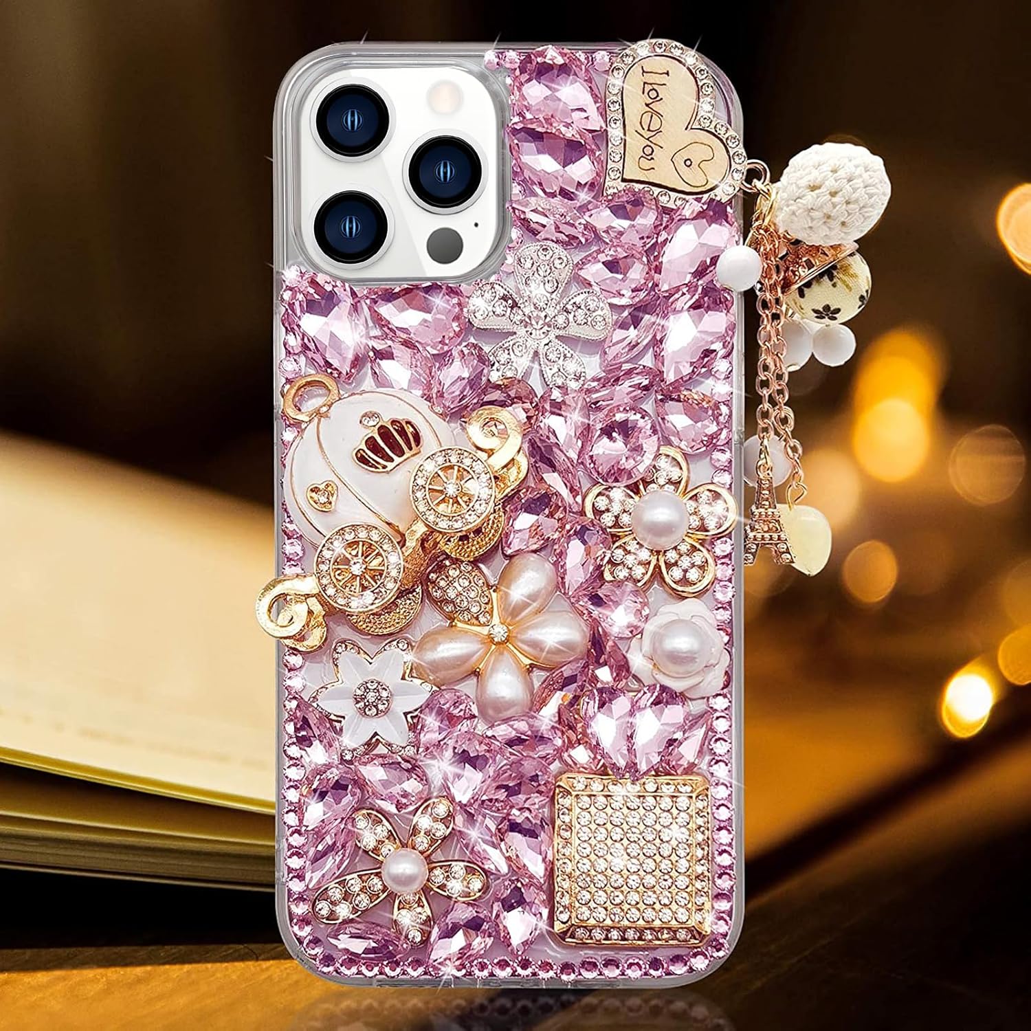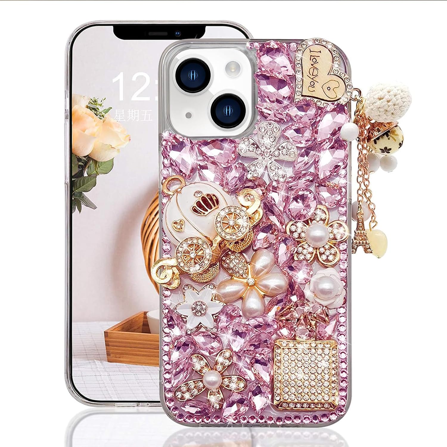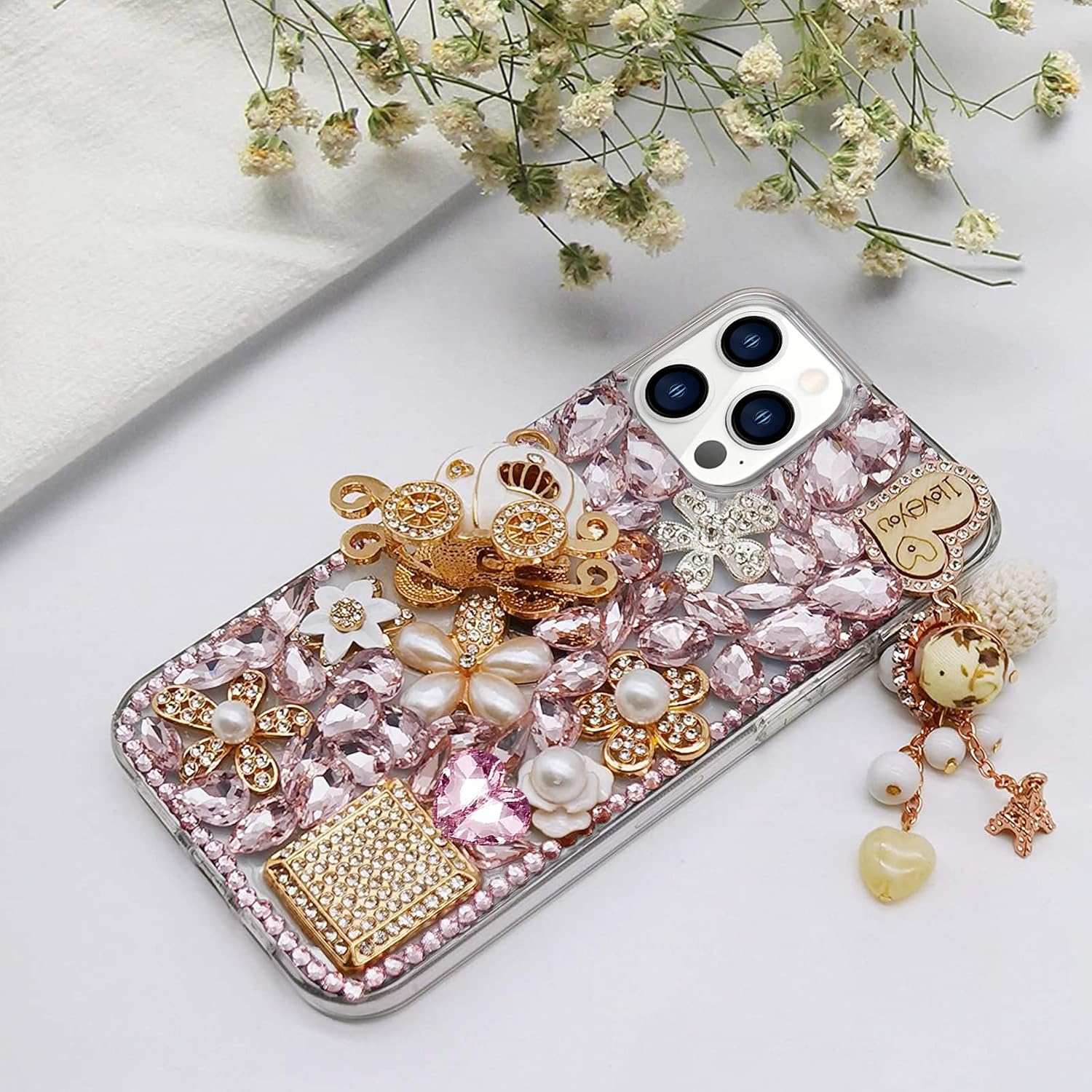 - Guppy for iPhone 14 Pro Max Bling Glitter Case,Luxury Diamond Rhinestone Gemstone 3D and Flower Gemstone Pumpkin Car Tower Pendant Pearl Soft TPU Back Cover Case for Women Pink