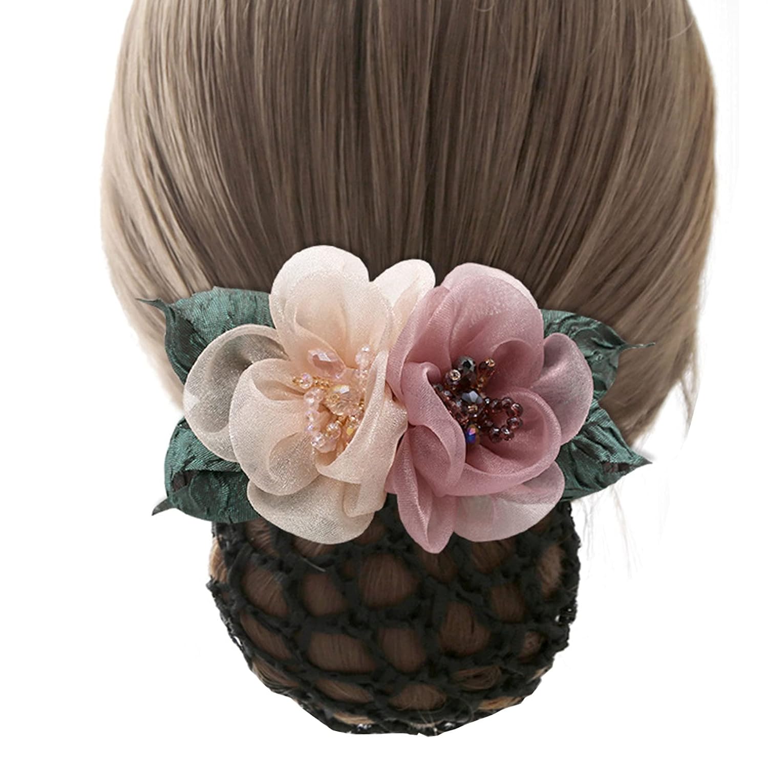 - -- when your hair is gathered at the back, the hair bow with hairnet is neatly tucked within the barrette net, contributing to a tidy and neat look. This dance hair bun nets is versatile and will complement most dresses, suits, and other outfits well. this barrettes with bun cover provides a sense of professionalism, making it an ideal choice for office wear.