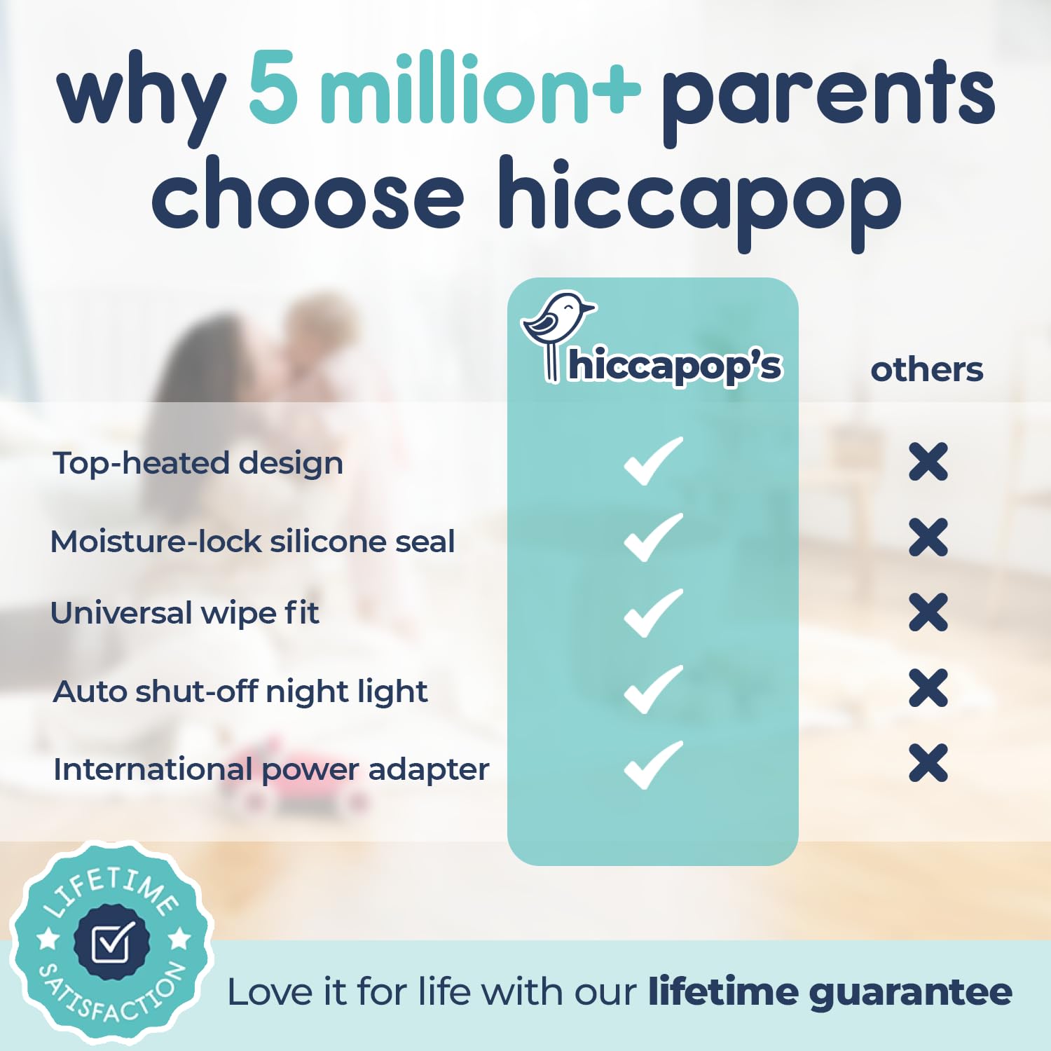 Thoughtfully designed and engineered by hiccapop to provide parents the safest, most durable and convenient wipe warmer on the market. Packed with innovation including: a premium silicone seal to ensure wipes stay moist, top-heated design to keep wipes at the TOP of the box warmest, integrated changing light and illuminated power button that shuts off automatically after 10 minutes and NEW detachable cord that works with USA and International voltages. Our high-capacity unit conveniently holds up to a week’s worth of wipes and is backed by hiccapop for life!